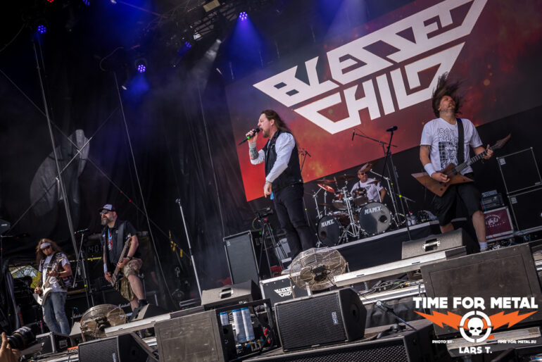 Der musikalische Auftakt obliegt dem Lokalmatador Blessed Child, der bereits am frühen Nachmittag den bereits reichlich anwesenden Menschen eine ordentliche Runde Thrash auf die Ohren haut. Das sonnige Wetter zieht die Fans schon früh aufs Gelände. Wie üblich geht der erste Track in die Binsen, dann läuft die Soundmaschine mit einem ordentlichen Groove. Blessed Child nutzen ihre sehr knapp bemessene Zeit für einen riffigen Festivalauftakt.