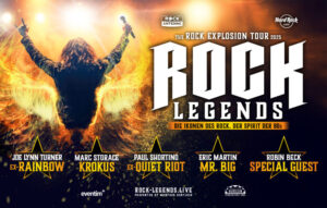 Die mit Spannung erwartete Rock Legends-Tour wird nicht wie ursprünglich geplant im Herbst 2025 stattfinden, sondern auf den Herbst 2026 verlegt. Damit erhalten die legendären Stars rund um Joe Lynn Turner (Rainbow), Robin Beck, Marc Storace (Krokus) und Paul Shortino (Quiet Riot) noch mehr Zeit, um eine Show auf die Beine zu stellen, die Rock-Fans in Deutschland und Österreich restlos begeistern wird. Produzent Manfred Hertlein erklärt: „Wir möchten unserem Publikum die bestmögliche Show bieten. Um diesem Anspruch gerecht zu werden, haben wir uns gemeinsam mit den Künstlern entschieden, der Tour mehr Vorlaufzeit zu geben. Für entstandene Unannehmlichkeiten möchten wir uns herzlich entschuldigen – gleichzeitig dürfen sich unsere Fans auf ein unvergessliches Konzerterlebnis im Herbst 2026 freuen.“
