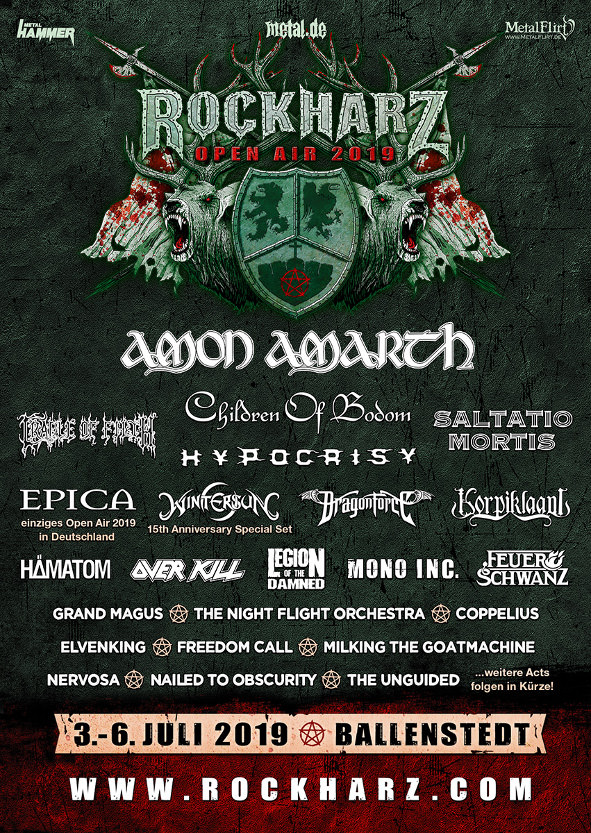 Es geht derzeit Schlag auf Schlag beim Rockharz Open Air. Das Billing für 2019 nimmt immer deutlicher Gestalt an, und nachdem am Dienstag mit HYPOCRISY, FEUERSCHWANZ und FREEDOM CALL drei weitere Hammer-Bestätigungen erfolgten, legen die Veranstalter heute mit einem weiteren Dreierpack nach. Neu dabei sind die Deutschrocker von KÄRBHOLZ, das A-Capella-Metal-Gespann VAN CANTO und die Power Metal-Newcomer WARKINGS.