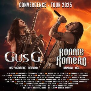 Die Convergence-Tour, die durch Europa führt, hat in Nürnberg ihren Tourstart – und 300 Fans sind dem Aufruf gefolgt. Leider ist die Vorband – Last Temptation – nicht mit an Bord, dafür darf Gus G., seines Zeichens ehemaliger Lead-Gitarrist von Ozzy Osbourne und der kreative Kopf von Firewind, zusammen mit Basser Andrea Arcangeli ein kleines Instrumental Set zum Einstieg um 20 Uhr vom Stapel lassen. Dann darf der Meister himself, Ronnie Romero, ran. Energiegeladen, voller Schwung und Lust an der Musik und an den Songs: So kennt man den Frontmann von Rainbow, der ehemaligen Stimme von Michael Schenker Group und Mitglied der Heavy-Metal-Supergroup Elegant Weapons.