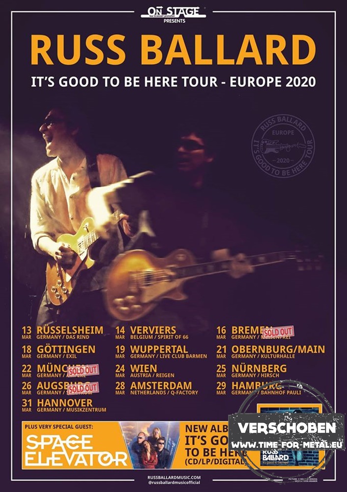 Der britische Rockmusiker Russ Ballard verlegt die komplette It`s Good To Be Here Tour-Europe 2020 wegen des Coronavirus. Die Tour soll später im Jahr nachgeholt werden, die Tickets behalten ihre Gültigkeit. Für die späteren Termine die Facebook-Seite im Auge behalten: https://www.facebook.com/RussBallardMusicOfficial/