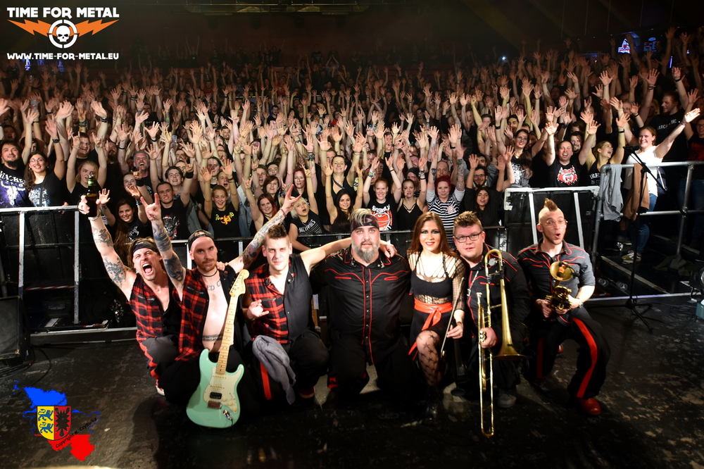 “I changed my Vodka for the Whisky that’s why I got this voice. I changed my Olga for the Britney because I have no choice”. Mit diesen Zeilen fängt Change an und lässt Georgijs russische Vergangenheit vergessen machen, auch wenn die englische Sprache einen deutlichen Akzent hat. Bassist Dimitij Miller und Schlagzeuger Mario Stübler liefern auch bei diesem Song den fetten Rhythmus, auf dem sich Engel Mayr auf der Gitarre austoben darf. So ergeben alle diese Musiker eine Einheit, die sich in den Songs widerspiegelt. Die Anwesenden nehmen diese Energie auf und wandeln sie in Tanz, Pogo, Mitsingen und Crowd Surfer um. Obligatorisch darf dann auch der Psycho Traktor nicht fehlen, und nachdem sich eine hübsche Mitte mit entsprechendem Pappschild auf den Schultern eines kräftigen Untermannes findet, fordert Georgij die Anwesenden zum Rennen im Kreis um diese Mitte auf. Dabei ist Sicherheit oberste Pflicht und der Frontmann fordert zur schnellen Hilfe im Falle eines Sturzes auf. Das wird auch gleich erfolgreich getestet. Die in rot-schwarzen, Dschingis Khan ähnliche Kostüme gekleideten Musiker bringen dadurch die sowieso schon aufgeheizte Halle zum Kochen und Schwitzen. Sie selbst bleiben davon auch nicht verschont und so ist das Oberteil von Georgij nach kurzer Zeit bereits klatschnass und klebt am kräftigen Oberkörper.