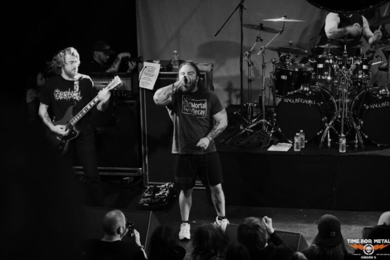 An den Saiteninstrumenten stehen Ced Davis und Drew Arnold, die sich die massiven Riffs gegenseitig zuschieben. Mal schleppend und doomig, dann wieder abrupt und brutal – ein Wechselbad aus zähem Groove und plötzlicher Explosion. Am Schlagzeug sorgt Cody Davidson für das stabile Fundament, treibt mit Blastbeats an und lässt die Songs dennoch atmen, wenn das Tempo gedrosselt wird. Von der Empore aus wirkt das Ganze fast noch intensiver. Das dunkle Licht, die Nebelschwaden, der kreisende Pit unter mir – es hat etwas von einer archaischen Höhlenzeremonie. Songs wie Repulsive Demise, Rotted Entanglement, A Lesson In Savagery, Face Ripped Off, Felony Abuse Of A Corpse oder Dragged By A Truck verwandeln den Innenraum in ein wogendes Meer aus Haaren, Fäusten und verschwitzten Shirts. Spätestens bei Permanently Fucked brüllt der komplette Saal mit. Auch wenn ich diesmal nicht mitten im Getümmel stehe, ist die Intensität ungebrochen. Das Spektakel endet so kompromisslos, wie es begonnen hat. Ein letztes Dröhnen, ein paar abschließende Worte von Swank und dann gehen die Lichter an.