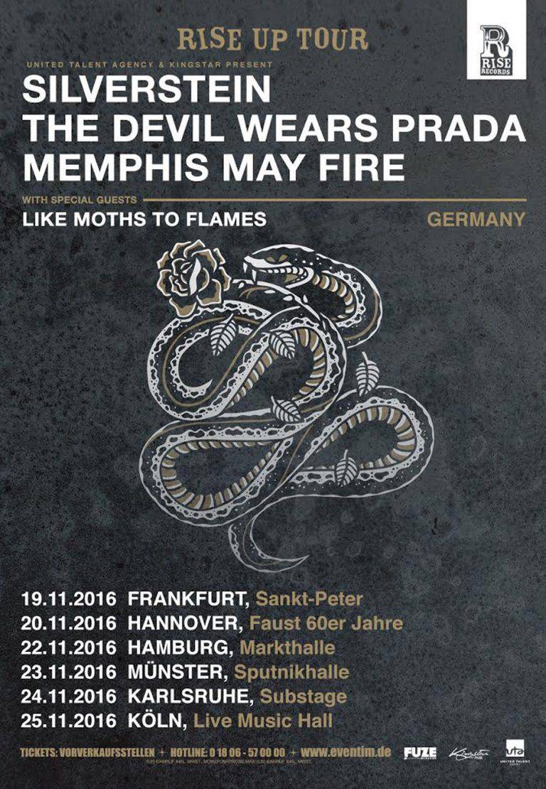 Viele Bands haben eines gemeinsam, was vielleicht Zuhörer gar nicht so genau wissen: Das Plattenlabel! Nun hat sich das Label Rise Records etwas sehr feines ausgedacht und zwar einfach mal vier Bands von ihnen zusammen auf Tour zu schicken. Die Idee alleine ist schon einmal genial, doch es wird noch besser: Die Reihenfolge, welche Band wann spielt, ist stets unterschiedlich. Immer ein neuer Headliner in einem anderen Land. Mit Silverstein, Memphis May Fire, The Devil Wears Prada und Like Moths To Flames hat Rise Records ein starkes Line-Up aufgestellt – doch kann dieses auch überzeugen?