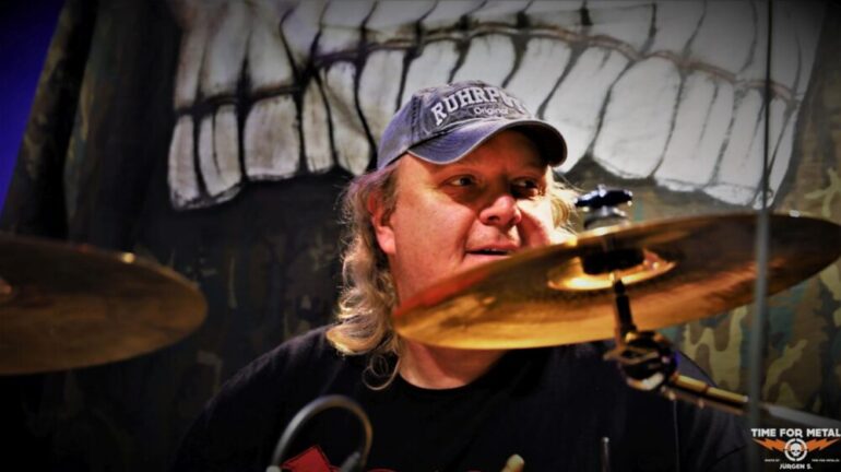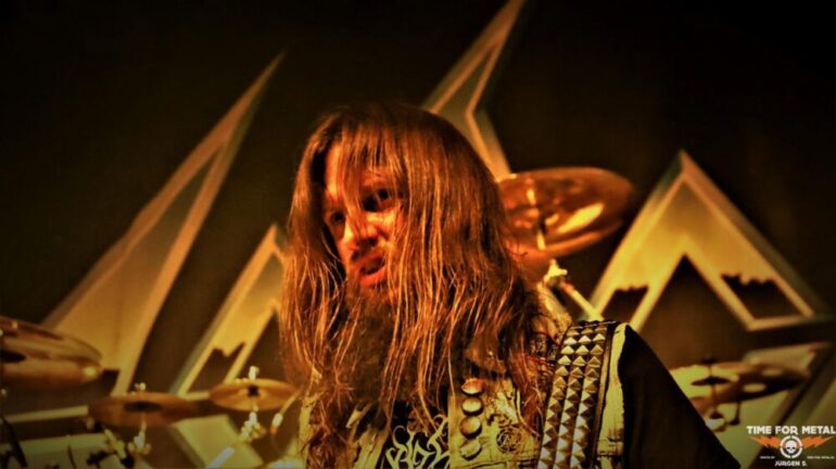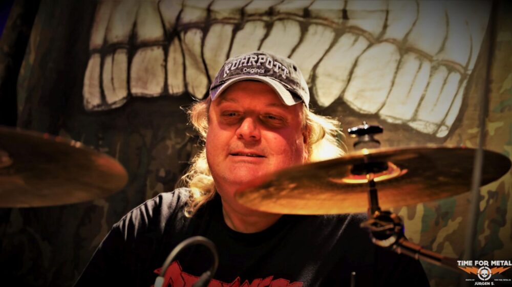 Darkness Schlagzeuger und Band-Urgestein Lacky (Andreas Lakaw) sitzt schon fast winzig und „kümmerlich“ vor dem Sodom Schlagzeug an seinem kleinen Schlagzeug. Damit gibt er allerdings mächtig Gas. Seine Mitstreiter neben ihm spielen sich so nach und nach richtig in Rage. Lacky kann sich das Grinsen nicht verkneifen.
