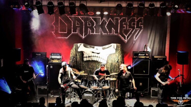 Pünktlich wird hier angefangen. Ganz besonders freue ich mich auf die Essener Darkness, die ich immer schon mal sehen wollte. Heute Abend ist es dann endlich so weit. Der Topact Sodom hat sich schon vor Beginn recht breit gemacht und dem Quintett nicht viel Platz oben auf der Bühne gelassen, denn da ist bereits alles für Sodoms Gig nachher vorbereitet. Deren Schlagzeug steht dort mächtig platziert und abgedeckt auf der Bühne.
