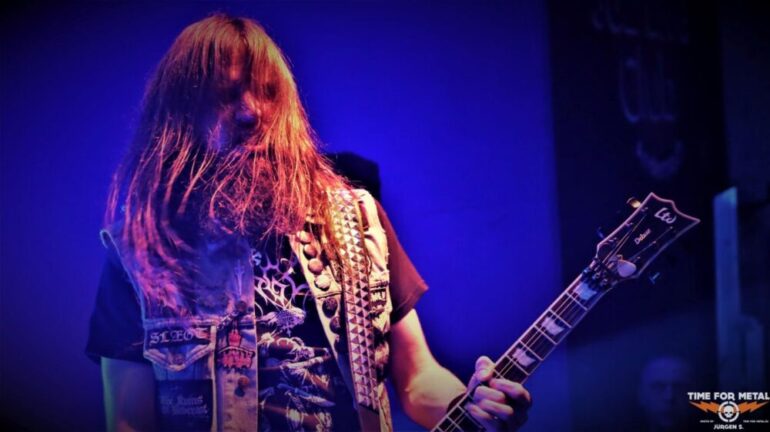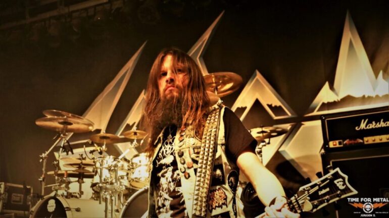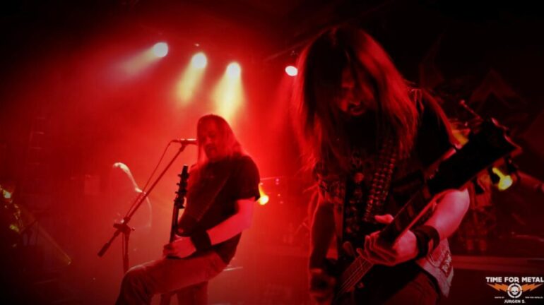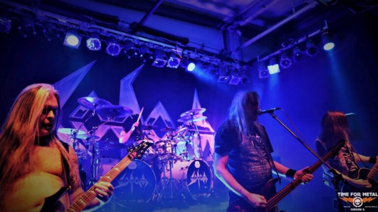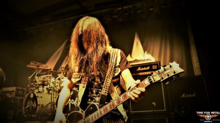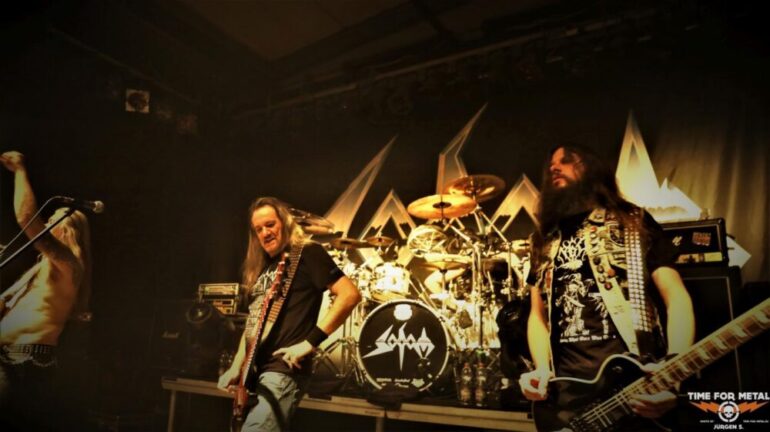 Sodom waren fast genau auf den Tag vor drei Jahren, am 27.12.2019 kurz vor Corona hier. 2019 noch mit Husky (Stefan Hüskens, Asphyx, ex-Desaster) am Schlagzeug. Damals ein Heimspiel für die Band mit Husky, der hier richtig abgefeiert wurde. Die Stöcke hat mittlerweile Toni Merkel übernommen. Aber auch ohne den Koblenzer Husky werden Sodom um Frontmann Tom Angelripper gebührend empfangen. Genauso wie gestern Tankard, haben die Gelsenkirchener Sodom 40 Jahre auf dem Buckel. Heute Abend werden 40 Years Of War – The Greatest Hell Of Sodom (Titel der letzten Veröffentlichung vom Oktober 2022) gefeiert. Tom Angelripper ist Sodom, er ist das einzige verbliebene Bandmitglied aus der Gründungszeit. Da sind schon viele gekommen und gegangen. Jetzt könnte man vielleicht meinen, das Ganze sei eine Ein-Mann-Show. Weit gefehlt, denn dafür sind die beiden Gitarristen Frank Blackfire und Yorck Segatz viel zu gut. Beide sind zwar erst seit 2018 dabei (Franck Blackfire auch schon vorher mal von 1987 bis 1989), aber was die beiden mit ihren Saiteninstrumenten raushauen, ist echt sensationell. Da könnte sich der „alte Mann“ Tom Angelripper eigentlich drauf ausruhen, das tut er allerdings nicht. Der Frontmann gibt hier natürlich auch mächtig Gas. Klar geht es mit den Songs durch die 40 Jahre Geschichte der Band, auch immer mit ein paar Ansagen von Tom Angelripper begleitet. Wenn man die beiden Gitarren hier als Sägen bezeichnen wollte, dann könnte man hier getrost sagen: The Saw Is The Law, denn das ist heute Abend ein mächtiges, ohrenbetäubendes Gitarrengewitter hier.