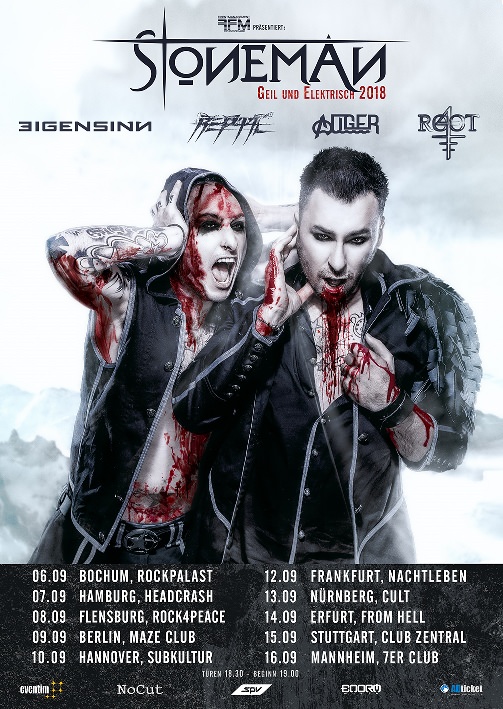 Als Elektro Supershow werden die Jungs als erstes das komplette STONEMAN Hitprogramm mit der Brechstange kurz und klein schlagen, um es danach mit größter Sorgfalt und Detailverliebtheit zu einem wunderschön schrägen Kunstwerk zusammenzubauen. Pressfrisch mit im Gepäck das zum Sommer 2018 erscheinende EP Album „Geil und Elektrisch“. Nicht nur Neues, ebenso bekannte Gothic Tempel – Knaller wie „MORD IST KUNST“, „WER FICKEN WILL“, „LIEBE LIEBE“, „GOTT WEINT“ sowie STONEMANS allererster Über-Hit „DEVIL IN A GUCCI DRESS“, werden tief in Herz und Magengrube treffen.