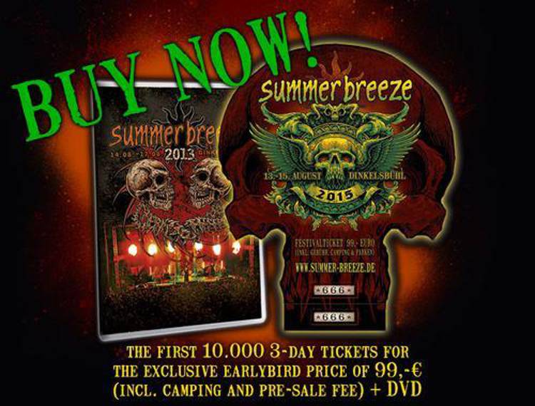 Die ersten 10.000 bestellten 3-Tages-Tickets für das SUMMER BREEZE Open Air 2015, das euch vom 13. – 15. August 2015 die Metalparty des Jahres bescheren wird, könnt ihr als exklusives Frühbucherpaket für 99,- € (inkl. Camping und Vorverkaufsgebühr) inklusive der auf 10.000 Stück limitierten SUMMER BREEZE 2013 DVD bestellen. Enthalten sind diesmal Clips von u.a. Sabaton, Vader, Powerwolf, The Bones, Mustasch, Illdisposed, Evocation, Atrocity uvm. sowie detailreiche, informative und amüsante Reportagen und Interviews der Festivalfreunde von EMProckinvasion.