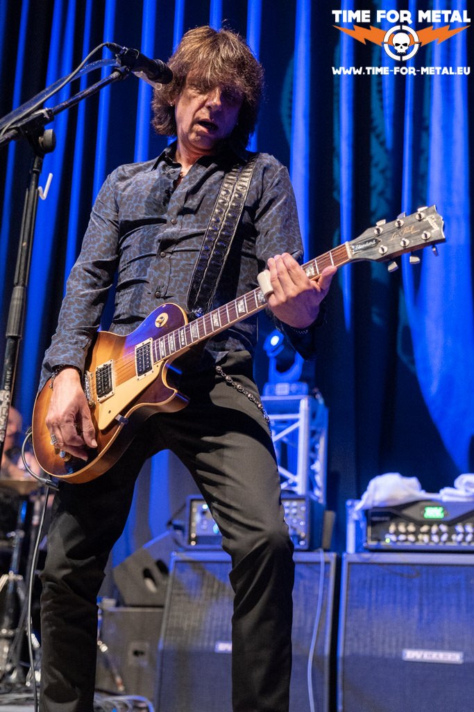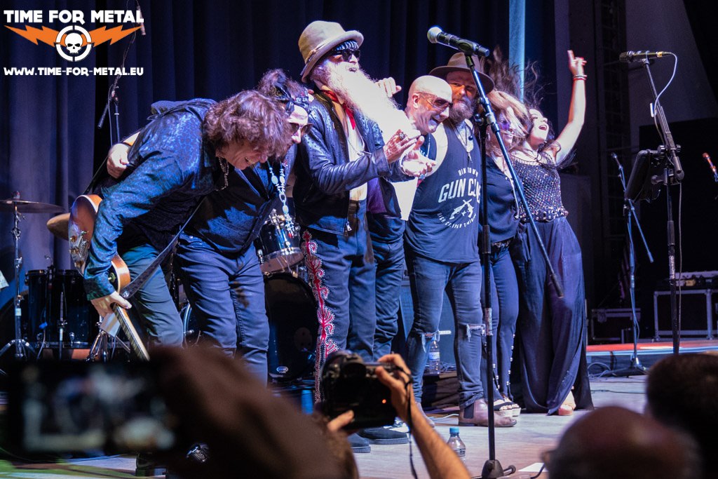 Die musikalische Ausrichtung ändert sich, als dann Billy F. Gibbons nach etwas mehr als der Hälfte der Spielzeit die Bühne betritt. Von Kris Barras ausführlich angesagt und mit lautem Applaus empfangen wird der sehr dünn gewordene Billy, dessen Gesicht man unter dem Hut und der großen Sonnenbrille fast gar nicht sieht. Der Bart ist kürzer geworden, ist aber, neben der sehr schönen roten Gitarre, nach wie vor ein Blickfang. Fast 70 (in Worten: siebzig!!!) Jahre alt ist Billy mittlerweile, weiß aber immer noch, wie der Blues geht. Das wird klar, als er seiner Gitarre die ersten Töne entlockt und mit dem ZZ Top-Song La Grange zur zweiten Showhälfte einleitet. Man sieht es insbesondere Kris Barras, der ja mit seiner eigenen Band The Kris Barras Band auch schon seit über 10 Jahren sehr erfolgreich ist, durchaus an, dass er stolz darauf ist, mit einer Ikone wie Billy die Bühne teilen zu dürfen. Ganz zum Schluss der regulären Setlist gibt es dann auch tatsächlich den zweiten Song, den auch ich kenne, nämlich Sharp Dressed Man, den ZZ Top im Jahr 1983 (!!) in die Charts gehievt haben. Nach Zugaben müssen wir nicht lange rufen, nach zwei Coverversionen – Got My Mojo Working (Ann Cole Cover) und Going Down (Moloch Cover) – geht es dann aber hinaus in die Nacht.