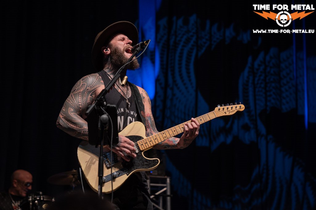 Da schon alles für Supersonic Blues Machine aufgebaut ist, dauert es dann auch nicht lange, bis die nacheinander und unter dem Beifall der Anwesenden die Bühne betreten. Ich bin zugegebenermaßen sehr überrascht, denn ich hatte eigentlich eher Herren im Stile von Chris Kramer erwartet. Aber nein, Sänger/Gitarrist Kris Barras, der erst im April dieses Jahres bei der Supersonic Blues Machine eingestiegen ist und damit Lance Lopez ersetzt hat, kommt mit einem Muscleshirt, zerrissenen Jeans und bunten Tattoos auf den Armen daher. Bassist Fabrizio Grossi, der sich seiner Jacke schon nach wenigen Songs entledigt, trägt genau wie Drummer Kenny Aronoff die gesamte Show über Sonnenbrille. Damit wäre der Kern von Supersonic Blues Machine beisammen. Auf dem zweiten Album Californisoul, das im vergangenen Oktober erschien, kann man dann noch mit Gastauftritten von Billy F. Gibbons, Steve Lukather, Eric Gales, Robben Ford und Walter Trout aufwarten. Den erstgenannten werden wir ja heute auch noch live erleben dürfen. Los geht es aber erst einmal zu siebt, und ich komme sehr schnell ins Schwitzen, denn bei den sehr funkigen Bluesnummern, die überwiegend vom Album Californicoul stammen und die die Männer mit ihren Backgroundsängerinnen da zusammen zocken, kann ich nicht stillstehen. Dafür ernte ich einige verwunderte Blicke, denn die meisten Anwesenden stehen – für mich sehr erstaunlich – nur da, die Blicke auf die Bühne gerichtet, und lauschen der Musik. Ok, anderes Publikum als sonst! Dass allerdings auch Männer in meinem Alter mit sehr viel Ausdauer ihre Handys in die Luft recken, um Fotos oder auch Videos zu machen, hatte ich noch weniger erwartet. 😀