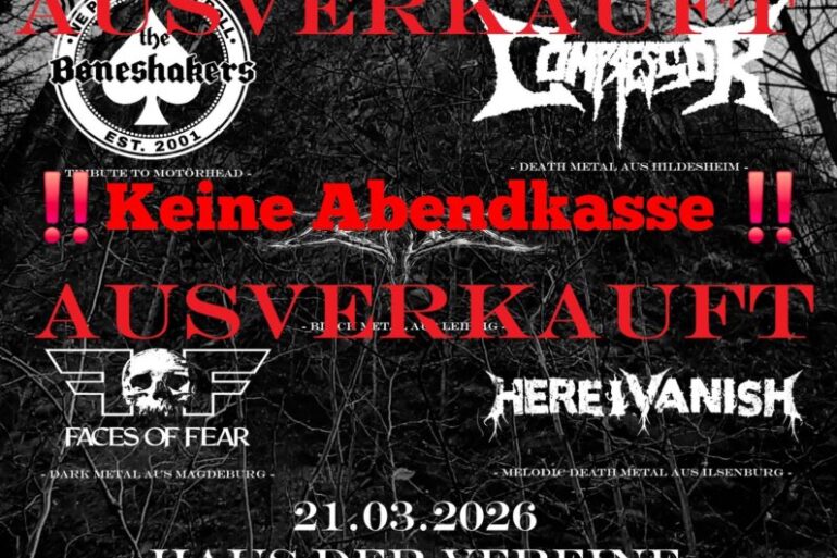 Eventname: Hellfire Over Ilsenburg Part IV Headliner: The Bøneshakers Vorbands: Here I Vanish, Faces Of Fear, Zeit, Compressor Ort: Haus...
