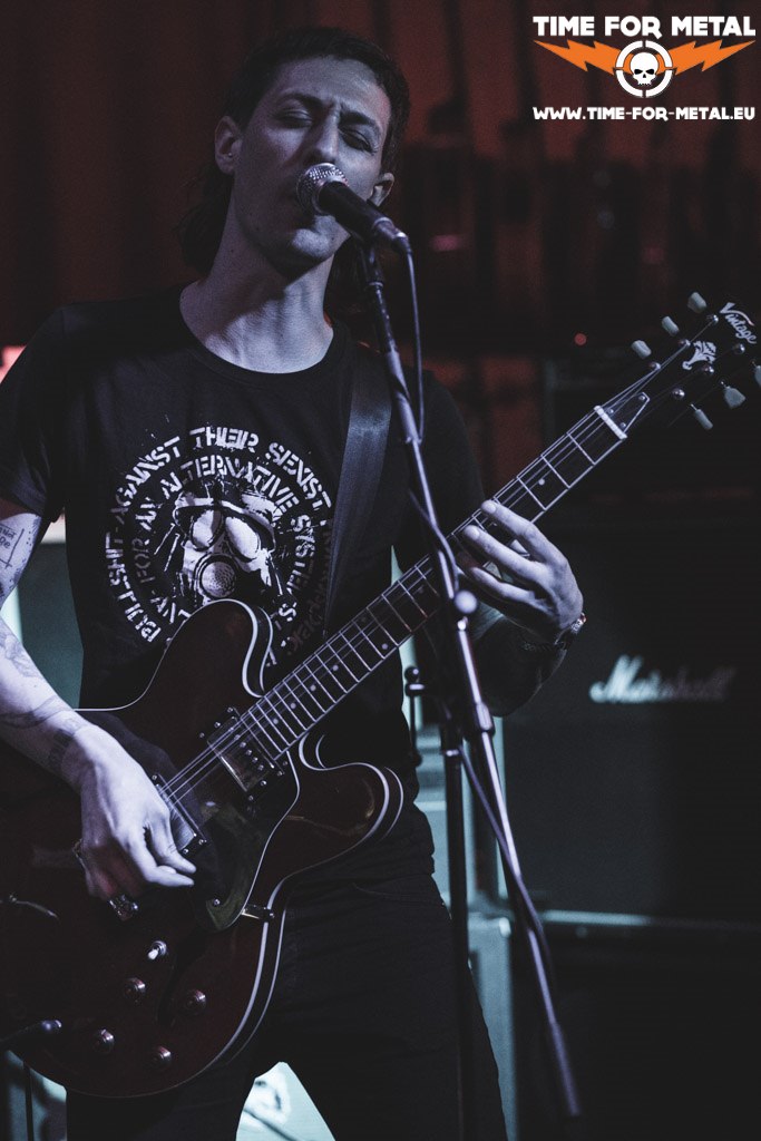 Was ganz anderes gibt es mit Ewig.Endlich, die sich jetzt bereit machen. Ich muss ja gestehen, dass ich, als ich mir für den Vorbericht einige Songs angehört habe, nicht so ganz wusste, was ich davon halten soll. Aber jetzt und hier, live und mit der entsprechenden Show, verschlägt es mir die Sprache und ich vergesse fast zu fotografieren. Insbesondere Sänger Simon trägt die Songs nicht nur vor, nein, er visualisiert und lebt sie förmlich. Das ist ganz großes Kino, was der Junge und seine Bandkollegen da auf die Bühne bringen. Ewig.Endlich hatten ja ebenfalls am 13.04. ihr Debütalbum veröffentlicht, Auf Grund heißt es und wartet mit neun Tracks auf. Fünf davon präsentieren Ewig.Endlich heute, außerdem gibt es mit Im November tatsächlich auch schon einen neuen Song. Nach dieser sehr intensiven Show mit postapokalyptischen Texten – da zitiere ich einfach mal meine Worte in unserem Instagram-Post – brauche ich doch eine Weile, um wieder im Rare Guitar anzukommen. Der strahlende Sonnenschein, der mich draußen empfängt, hilft dabei ein wenig. Da muss ich dann tatsächlich noch zum Merch und gönne mir gleich mal die CD Auf Grund, sehr nettes Gespräch mit Simon inklusive.