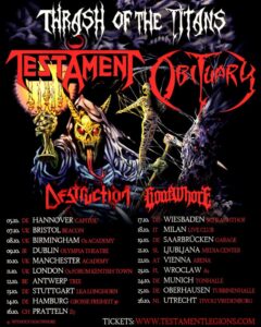 Eric Peterson (Gitarre) von Testament äußerte sich dazu: „Alright! We are super excited to announce the beginning of our Thrash Of The Titans campaign event! Coming to Europe this October with co-headliners Obituary and very special guests Destruction & Goatwhore! We will have a special deep cut set along with classics and of course some new songs! Obituary will be doing a special set as well doing their classic “cause of death” material and Destruction also will have new record out as well! Looking fwd to see you all again out there! Long live Thrash! Long live metal!“