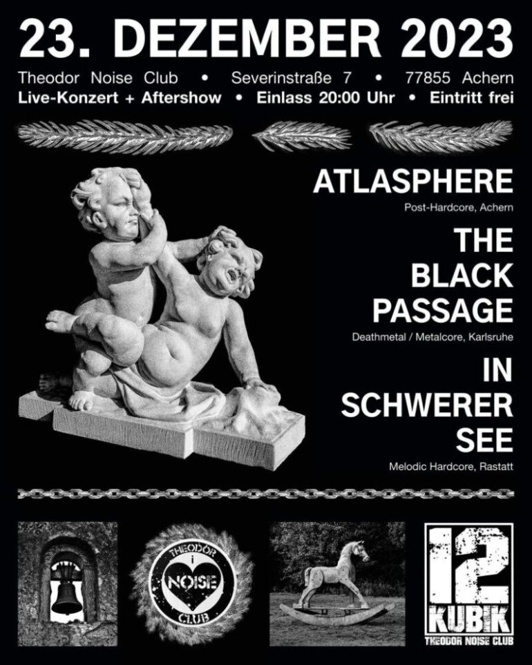 Am 23.12.2023 laden Atlasphere zu ihrem Weihnachtskonzert im Theodor Noise Club ein. Supportet werden sie dabei von The Black Passage und In Schwerer See. Wer also zu etwas Hardcore und Death Metal in vorweihnachtliche Stimmung kommen möchte, sollte an diesem Abend nach Achern kommen.