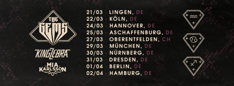 Flankiert werden The Gems von einem starken Support-Paket. King Zebra aus der Schweiz stehen für hochenergetischen Hardrock mit starken Melodien um Frontmann Eric St. Michaels. Zusätzlich verstärkt Mia Karlsson das Line-Up dieser Tour und sorgt dafür, dass die Betriebstemperatur in den Clubs von der ersten Minute an am Limit läuft.