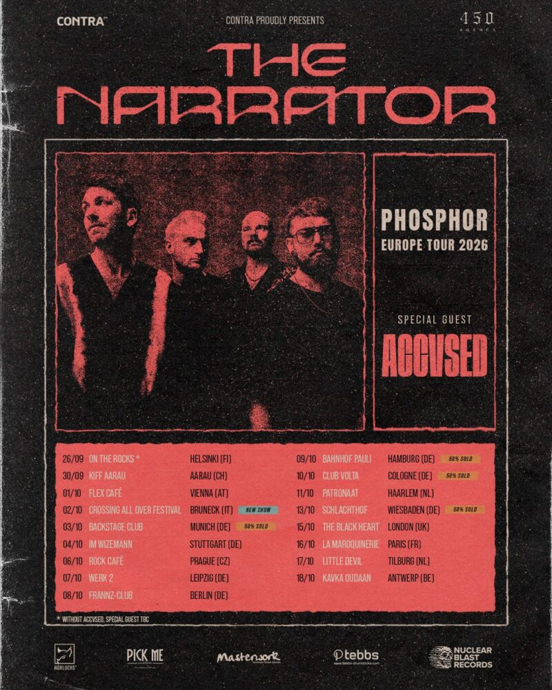 The Narrators mit Spannung erwartetes neues Album Phosphor erscheint am 8. Mai 2026 über Nuclear Blast Records. Der Nachfolger ihres gefeierten Debütalbums Lore bietet zehn mitreißende Songs, die auf die globale Krise mit innerer Erschöpfung reagieren und zeigen, wie nah Hoffnung und Selbstzerstörung beieinander liegen.