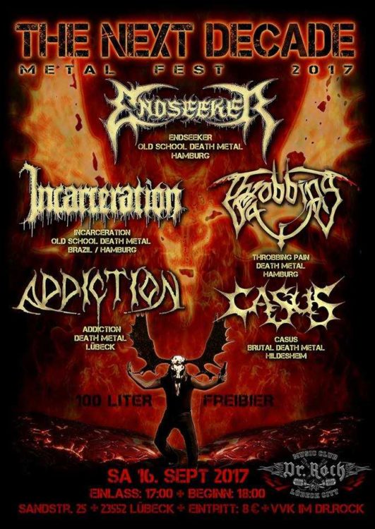 Als Event für eingefleischte Extrem-Metaller hat das Pilotprojekt des Next Decade Metal Fest im letzten Jahr erfolgreich debütiert – und die Hansestadt hat Blut geleckt. Die norddeutsche Death Metal Szene darf sich am 16. September 2017 mit den erlesenen Acts Endseeker, Incarceration, Throbbing Pain, Addiction und Casus abermals die strapazierte Nackenmuskulatur mit 100 Liter Freibier lockern.
