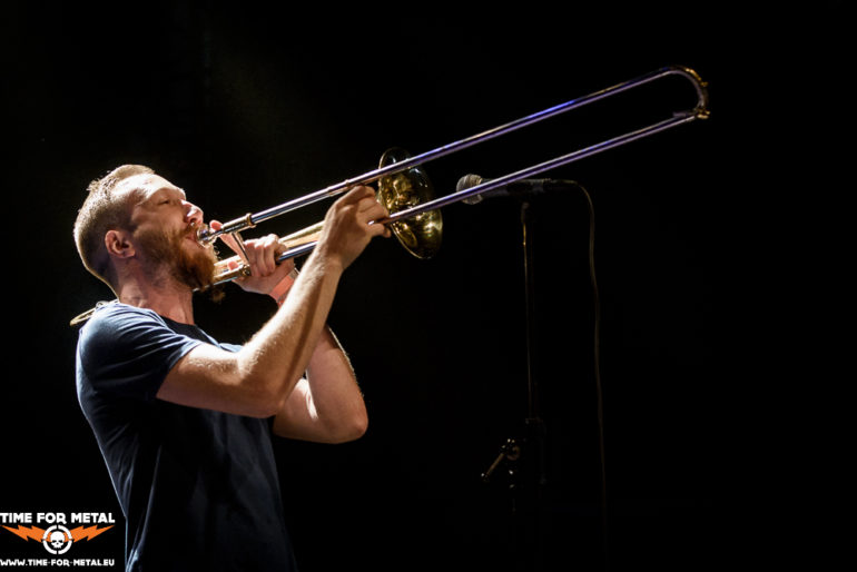 Die Band wurde zwar 1986 gegründet, aber seither mehrmals aufgelöst. Sowohl ihre Besetzung als auch die prägenden musikalischen Einflüsse und die Instrumente wechseln immer mal wieder. So war ich über den Einsatz einer Posaune und einer Hammondorgel doch einigermaßen erstaunt. Auch dass der Gesang hauptsächlich vom Schlagzeuger Duncan Redmonds kommt, aber das passt gut und die Stimmung steigt rapide, zumal nun das „Volk“ regelrecht ins Zelt stürmt.