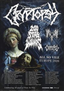 Die kanadischen Death-Metal-Ikonen Cryptopsy kündigen ihre All So Vile European Tour 2026 an. Als Special Guests sind 200 Stab Wounds, Inferi und Corpse Pile mit dabei – ein kompromissloses Paket für Fans extremer Musik.