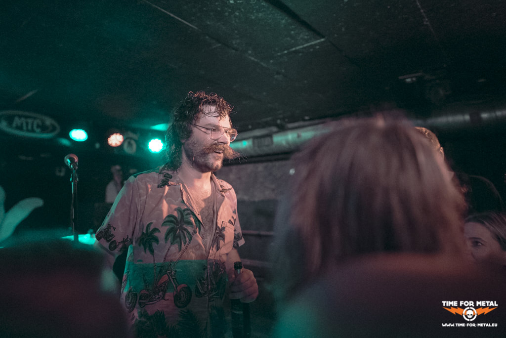 Dank der überschaubaren Produktion in einem kleinen Club, hält sich auch die Umbauzeit vor Tiny Moving Parts in Grenzen. Kurz das Backdrop aufgehängt, Instrumente ausgetauscht und schon kann es losgehen. Der Zuschauerraum ist mittlerweile bis auf den letzten Platz gefüllt und die Temperaturen steigen. Was allerdings passiert als die Männer um Sänger, Frontmann und Gitarrist Dylan Mattheisen auf die Bretter treten, übersteigt die Erwartungen der ahnungslosen Zuschauer um ein Vielfaches. Nach einem kurzen ‚Hello we’re Tiny Moving Parts, thank you for coming out‘ stimmt Mattheisen die aktuelle Single Applause aus dem neusten Album Swell (2018) an. Scheinbar kennen 80% der Besucher den Text in und auswendig und entgegnen dem Sänger mit überwältigender Lautstärke. Danach verwandelt sich das MTC in einen einzigen Pit, der vielleicht nicht die Härte einer Hardcore-Show aufweist, sich in Sachen Intensität aber vor wenigen anderen Bands verstecken muss. Hier bleibt kein Shirt trocken, kein Fuß steht still und die zahlreichen Crowdsurfer – die bedingt durch die Deckenhöhe von ca. drei Metern oft mit eben dieser und der Beleuchtung in Kontakt kommen – erinnern stark an die schlecht gefilmten Mitschnitte der verrückten Basement-Shows aus den ersten Tagen großer Bands, die man sonst sonst nur im Nachhinein auf YouTube bewundern kann. Auch die Band scheint überwältigt, wenn auch nicht sonderlich überrascht. Mr. Mattheisen, der schon genug Freude beim Singen und Gitarre spielen versprüht, wirkt nochmal drei Stufen fröhlicher und wird dadurch, durch die knappen, aber glaubwürdigen Ansagen und sein herzliches Erscheinungsbild zu einem der sympathischsten Menschen, die einem seit langem begegnet sind. Außerdem ist er mit hoher Wahrscheinlichkeit der Mensch im MTC, der sich heute Abend am meisten bewegt. Leider gehen vor lauter Energie der etwas ruhige und zurückhaltende Bassist und zweite Sänger Matthew Chevalier und sein Bruder, der Drummer Billy Chevalier – übrigens im waschechten 80er Jahre Pornodarsteller-Outfit: Pilotenbrille, Hawaii-Hemd und ein mächtiger Schnauzer – etwas unter. Das tut der Stimmung keinen Abbruch, das Publikum hängt dem Sänger jedenfalls das ganze Konzert über an den Lippen und an der Lautstärke der mitgesungenen Parts ändert sich im Laufe des Abends nichts mehr. Bei einigen Textstellen wird die PA gekonnt übertönt. Nach gut einer Stunde und zwanzig Minuten ist die Band auch schon am Ende des Sets angekommen, schafft es allerdings noch eine geplante und eine – verglichen mit den anderen Set-Listen der Tour – überraschende Zugabe zu geben.