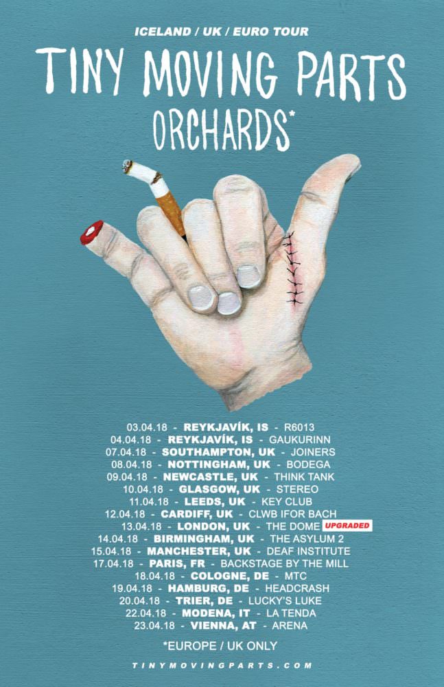 Schlanke 26°C zeigt das Thermometer an diesem sonnigen Apriltag in Köln. Wer das MTC kennt, weiß schon, welch schweißgetränkte Atmosphäre ihn erwartet. Als wenn das nicht schon genug wäre, ist die Show von Tiny Moving Parts bereits seit einiger Zeit ausverkauft. Der Gig startet verhältnismäßig spät – 20 Uhr Einlass, 21 Uhr Support. Diesen geben die Briten von den Orchards. Ganz gemütlich füllt sich der Laden erst kurz vor Beginn der Show. Als die drei Jungs und Sängerin Lucy Evers die Bühne betreten ist das MTC gut gefüllt, aber einige Ticketinhaber scheinen sich noch nicht eingefunden zu haben.