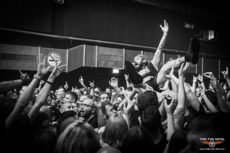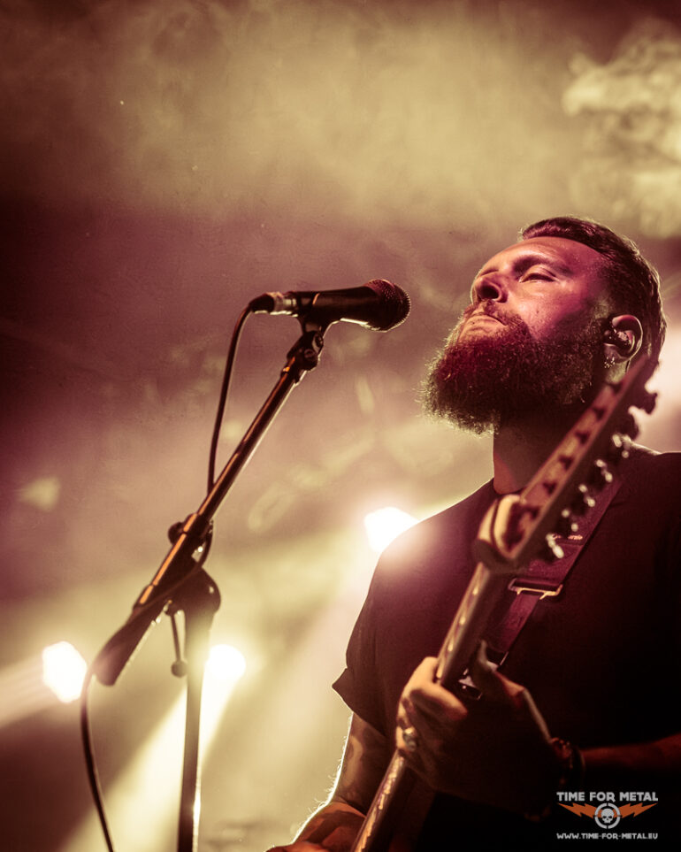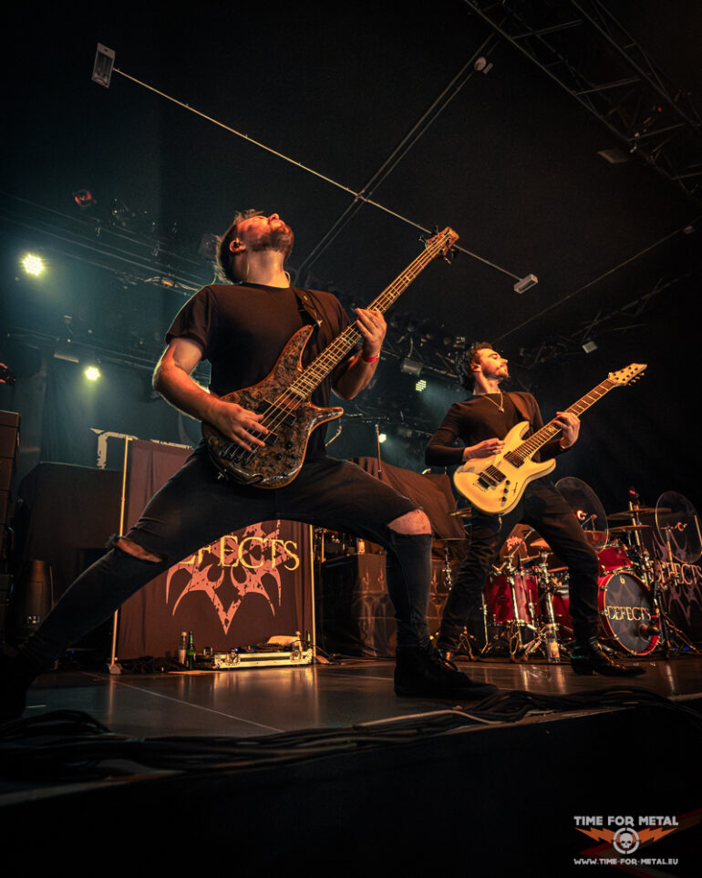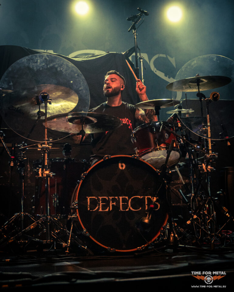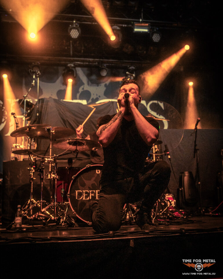 Es ist Punkt 20:00 Uhr und die Lichter gehen aus. Defects betreten die Bühne. Drei Songs Zeit, die besten Eindrücke mit der Kamera festzuhalten. Die Briten geben direkt Vollgas. Mit wuchtigen Gitarrenriffs, treibenden Drums und der Mischung aus Shouts und cleanem Gesang schaffen sie es, das Publikum in kürzester Zeit auf Betriebstemperatur zu bringen. Frontmann Tony Maue lässt das Publikum nicht lange warten und steht beim zweiten Song bereits auf den Absperrungen, während das Publikum den Raum mit seinen Handylichtern erleuchtet. Die ersten Crowdsurfer kommen im Graben an und die Stimmung ist jetzt schon richtig gut. Für einen Opener nicht selbstverständlich. Der Sound ist druckvoll, ohne dass die Vocals im Gitarrenbrett untergehen. Nach gut 35 Minuten verabschieden sich Defects nach einem absolut gelungenen Auftakt.