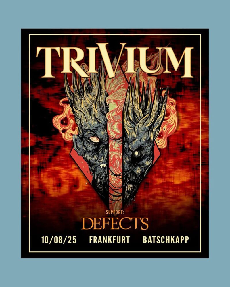 Es ist ein warmer Sonntagabend in Frankfurt, und während draußen die letzten Sonnenstrahlen für ordentlich Hitze sorgen, wird das wohl nichts im Vergleich zu dem, was heute Abend hier abbrennt. Vor der Batschkapp sammelt sich schon eine beeindruckende Schlange an Metalheads, bis raus auf die Zufahrtsstraße. Schwarze Shirts, lange Haare – das klassische Bild, nur hier und da unterbrochen von jüngeren Fans, die Trivium erst in den letzten Jahren für sich entdeckt haben. Heute ist es so weit: Die US-Metal-Titanen kehren nach Frankfurt zurück, und das in der legendären Batschkapp. Als Support haben sie die britische Band Defects im Gepäck und für mich wird das eine Premiere.