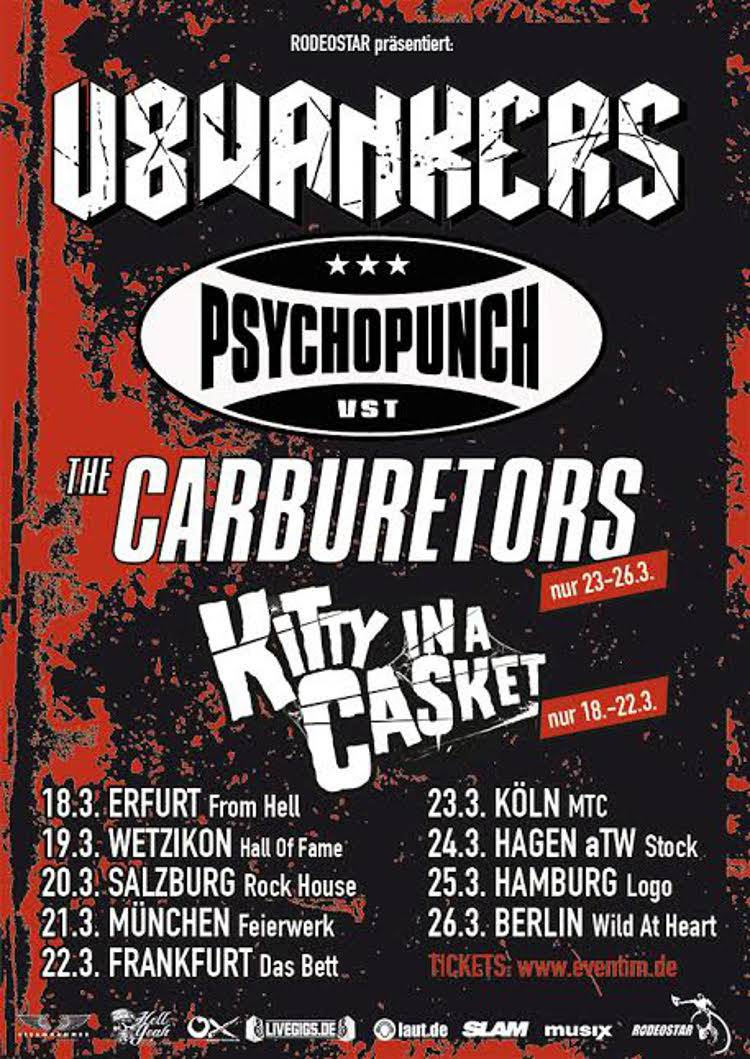 Dieses internationale Rock ‚n’ Roll Paket hat es in sich: Mit den deutschen Rock ‚n’ Rollern V8WANKERS, den Punkrockern PSYCHOPUNCH aus Schweden, der Punk-Rockabilly Band KITTY IN A CASKET aus Österreich und den norwegischen Fast-Forward Rockern THE CARBURETORS gehen vier krasse Live-Acts gemeinsam auf Tour im März 2016.