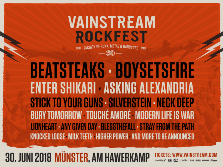 Westfalens „Festival der kurzen Wege“, das Vainstream Rockfest, findet auch im 13. Jahr seines Bestehens auf dem – bei Fans und Bands beliebten – Gelände am Münsteraner Hawerkamp statt und bietet Rockfans im kommenden Sommer das Beste aus Punk, Hardcore und Metal auf drei Open Air-Bühnen und einer Indoor-Stage. Die ersten Ankündigungswellen spülten mit Live-Monstern wie Beatsteaks, Enter Shikari, Asking Alexandria und Stick To Your Guns die Hochkaräter gleich paketweise an Land und beherbergten mit u.a. Neck Deep, Touché Amoré, Bury Tomorrow, Lionheart, Blessthefall und Stray From The Path weitere Bands, die klar zu den angesagtesten Rockacts dieser Tage zählen.
