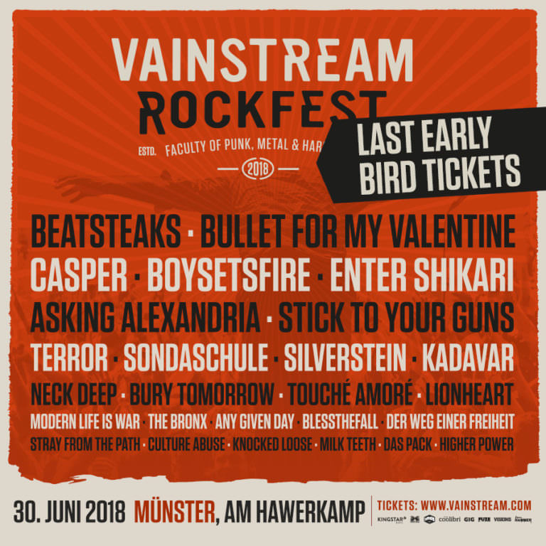 Westfalens „Festival der kurzen Wege“, das Vainstream Rockfest, findet auch im 13. Jahr seines Bestehens auf dem – bei Fans und Bands beliebten – Gelände am Münsteraner Hawerkamp statt und bietet Rockfans im kommenden Sommer das Beste aus Punk, Hardcore und Metal auf drei Open Air-Bühnen und einer Indoor-Stage. Die ersten Ankündigungswellen spülten mit Live-Monstern wie Beatsteaks, Enter Shikari, Asking Alexandria und Stick To Your Guns die Hochkaräter gleich paketweise an Land und beherbergten mit u.a. Neck Deep, Touché Amoré, Bury Tomorrow, Lionheart, Blessthefall und Stray From The Path weitere Bands, die klar zu den angesagtesten Rockacts dieser Tage zählen.