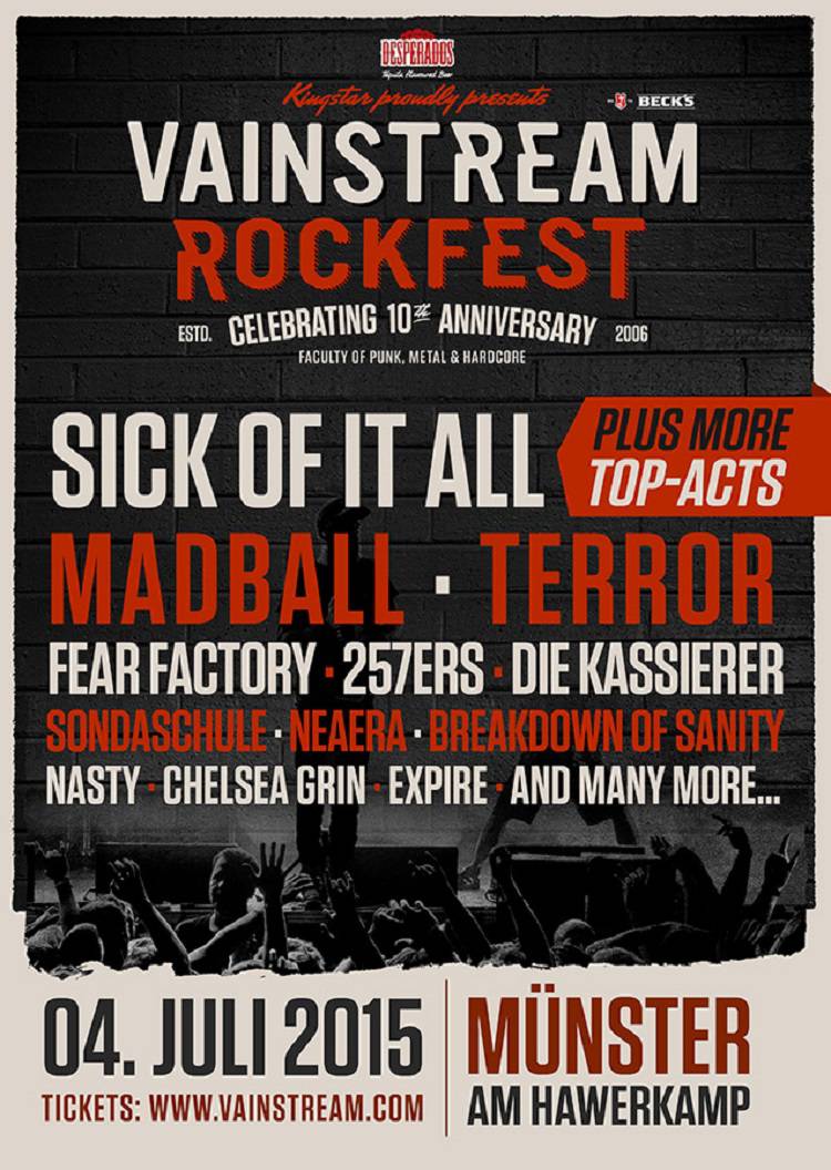 Angeführt von den Hardcore-Urgesteinen SICK OF IT ALL & MADBALL verkörpern die frisch bestätigten BREAKDOWN OF SANITY und NASTY die neue Marschroute im modernen Metal. Die ausgelassene Festivalstimmung ist ebenso garantiert. Neben dem momentan wohl erfolgreichsten Ska-Punk Act SONDASCHULE garantieren nicht zuletzt DIE KASSIERER und die frisch bestätigten Hip-Hop Überflieger 257ERS ein abwechslungsreiches Programm auf dem charmanten 1-Tages Festival.