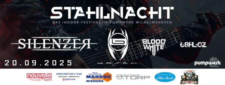 Es wird laut im Kulturzentrum Pumpwerk, wenn die Wilhelmshavener Band B.O.S.C.H. am Samstag, den 20.09.2025 zur bereits 9. Auflage der Stahlnacht aufruft, um den Fans der härteren Klänge einen ganz besonderen Konzertabend zu bieten, der mit stahlhartem Gitarrengewitter und hämmernden Bässen, dem Namen des beliebten Indoor- Rock-Festivals alle Ehre machen wird.