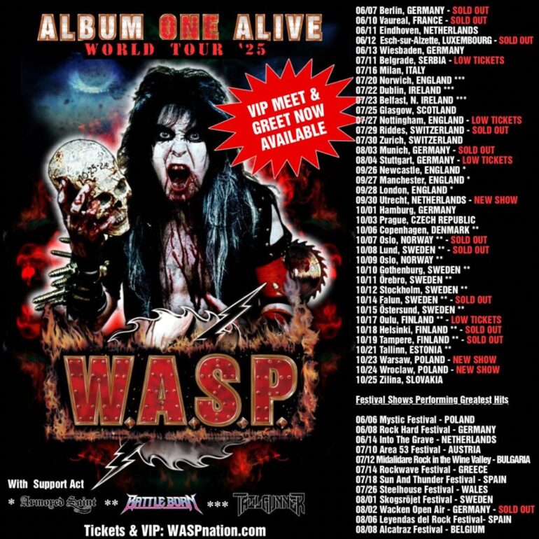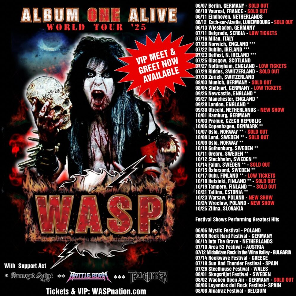 W.A.S.P. erweitern ihre 2025 Album ONE Alive Europatournee um Auftritte in Polen und den Niederlanden und kündigen zudem VIP-Pakete an. Der erste Teil der Europatour zum Album ONE Alive ist bereits abgeschlossen, mit ausverkauften Shows in Deutschland, Frankreich und Luxemburg sowie Headliner-Auftritten bei Festivals in Polen und Deutschland. Die ONE Alive Tour feiert das 40-jährige Jubiläum der Veröffentlichung des ersten Albums von W.A.S.P., indem das Debütalbum in voller Länge gespielt wird.
