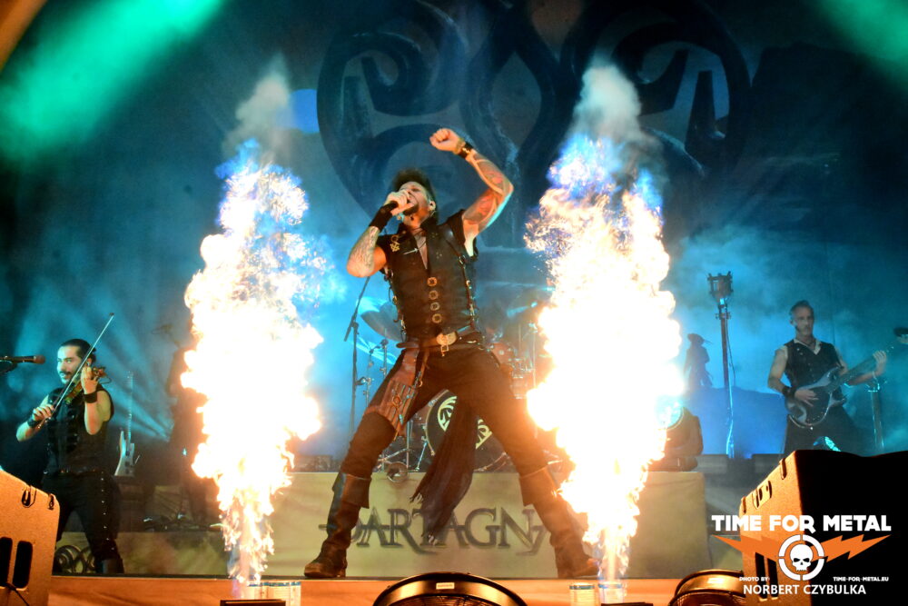 Eigentlich erwartet die Menge Orden Ogan, die deutsche Power-Metal-Band aus Arnsberg. Die Band ist auch vor Ort, der Merch aufgebaut, aber Schlagzeuger Dirk Meyer-Berhorn liegt flach. Nix geht mehr. Regionale Bands konnten infolge der Kürze der Zeit nicht aktiviert werden, so springen Tír Saor ein. Wie der Zufall es so will, ist das Duo schon vor Ort, denn es sind zwei Bandmitglieder der Band Storm Seeker. Frontmann und Sänger Manuel Depryck ist mit seinem Kollegen schon seit 2016 unterwegs und ist ein Scottish- und Irish-Folk-Duo. So sind sie heute ihre eigene Vorgruppe.