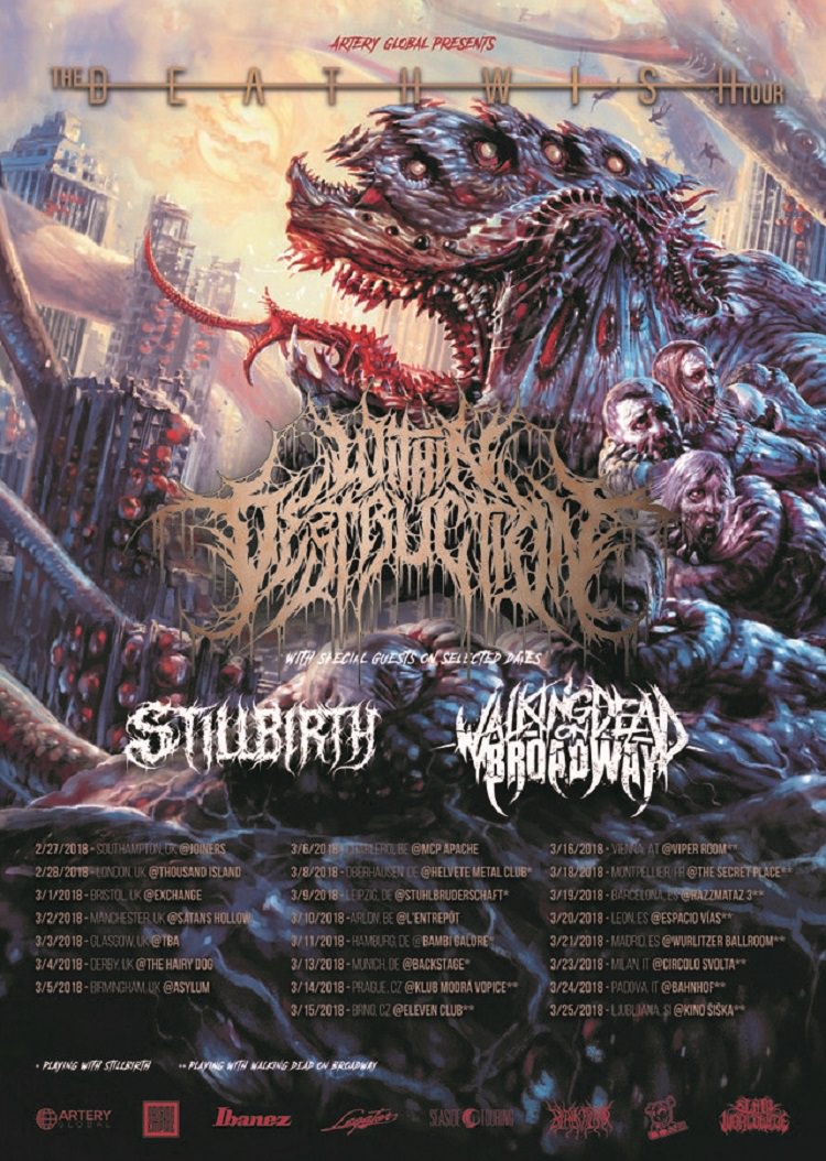 Die aufstrebende Leipziger Deathcore-Truppe WALKING DEAD ON BROADWAY hat ihr Zweitwerk »Slaves« Ende 2016 via Arising Empire auf den Markt gebracht, dem dann Anfang 2017 ihre eigene Headlinetour mit FALL OF GAIA folgte. Nun kehren die Jungs im März auf die Bühnen Europas zurück – dieses Mal jedoch als Support des slowenischen Deathcore-Monsters WITHIN DESTRUCTION. Dieses wird auf der Tour die Tracks seines kommenden Werks »Deathwish« präsentieren. Tickets für die Shows werden in Kürze erhältlich sein!