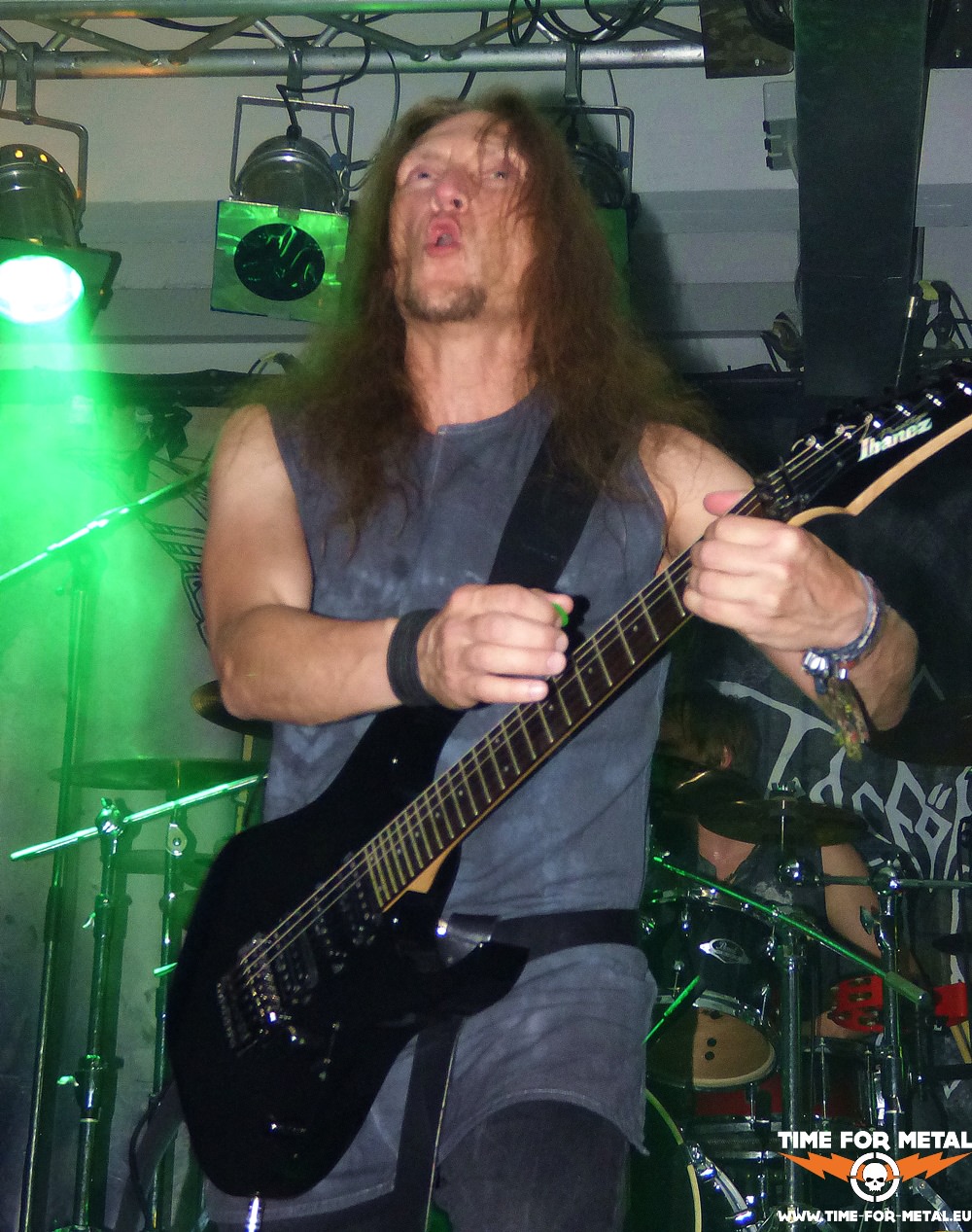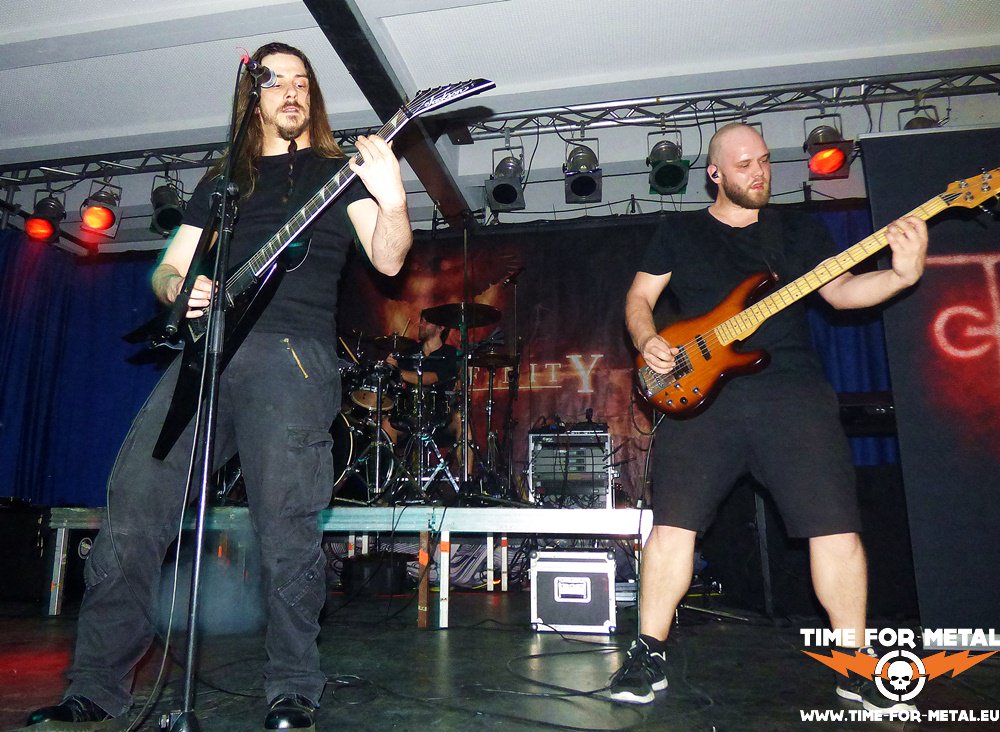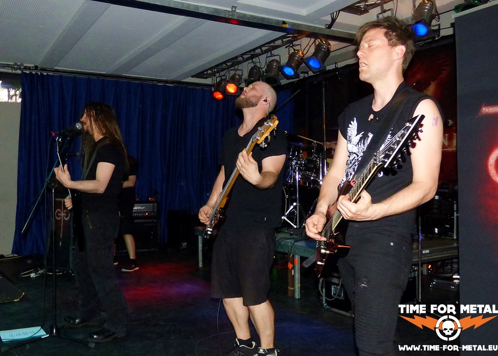 Frozen Infinity aus dem Raum Freiburg und Mannheim eröffnen pünktlich um 20:30 Uhr ihr Set. Das Quintett, das sich bereits 2001 gründete, besteht aus Michael „Anthrax“ Gerber (Vocals / Guitar), Tobias Jacobs (Guitar), Chris Hilfinger (Keyboards), Felix Jacobs (Bass) und Christopher Blei (Drums). Die Jungs sind in Süddeutschland und auch darüber hinaus längst keine Unbekannten mehr, bringen sie ihren Melodic Death Metal doch schon seit gut 17 Jahren (mit sechsjähriger Pause) unters Volk. Somit versammeln sich die Anwesenden logischerweise vorne vor der großzügig angelegten Bühne, und zu dem Opener Phoenix werden gleich die ersten Matten geschüttelt. Problem; hier vor der Bühne ist der Sound nicht besonders gut, was aber nicht an der Band oder am Soundmixer liegt, sondern einfach an der Location. Ein altbekanntes Problem in der Mensabar, in den hinteren Reihen ist der Sound einfach besser und geht einigermaßen gut ins Ohr. Ein paar einzelne Leute bleiben also gleich zurück, die allermeisten hier stört das aber offenbar wenig. Die Band um Shouter Anthrax ist gut drauf und gibt trotz der wenigen anwesenden Leute und des schlechten Sounds Vollgas. Ein weiteres bekanntes Problem bei Konzerten in der Mensabar, zu wenig Licht, zuviel Nebel …, manchmal, vor allem bei grünem Licht, sind die Musiker nur schemenhaft als Silhouette zu sehen. Stilistisch sind Parallelen zu skandinavischen Truppen wie z.B. In Flames und Children of Bodom nicht von der Hand zu weisen, doch durch die immerzu präsenten Keyboards von Chris Hilfinger und den Vocals sind Frozen Infinity doch wieder einzigartig und konnten sich immer mehr von den großen Vorbildern abheben. Mit den folgenden Songs bekommen wir eine gute Mischung aus Todesmetal-Härte und Harmonie auf die Mütze. Die Songs sind teils recht lang und mit unzähligen Soli versehen, wobei vor allem Tobias an der Gitarre hervorsticht. Fünf Songs stammen vom noch aktuellen Album Phoenix aus 2016, dazu bekommen wir zwei Songs vom Vorgänger Fragments Of I aus 2008 zu hören, wobei der Track Neverending Story auch schon auf dem Suicidal Seraphim – Demo aus 2006 vertreten war. Einzig den vorletzten Song Architect kann ich nicht zuordnen und weiß nicht, aus welcher Schaffensphase der Band er stammt. Our Words Are Law beendet den eindrucksvollen Auftritt nach gut 45 Minuten.