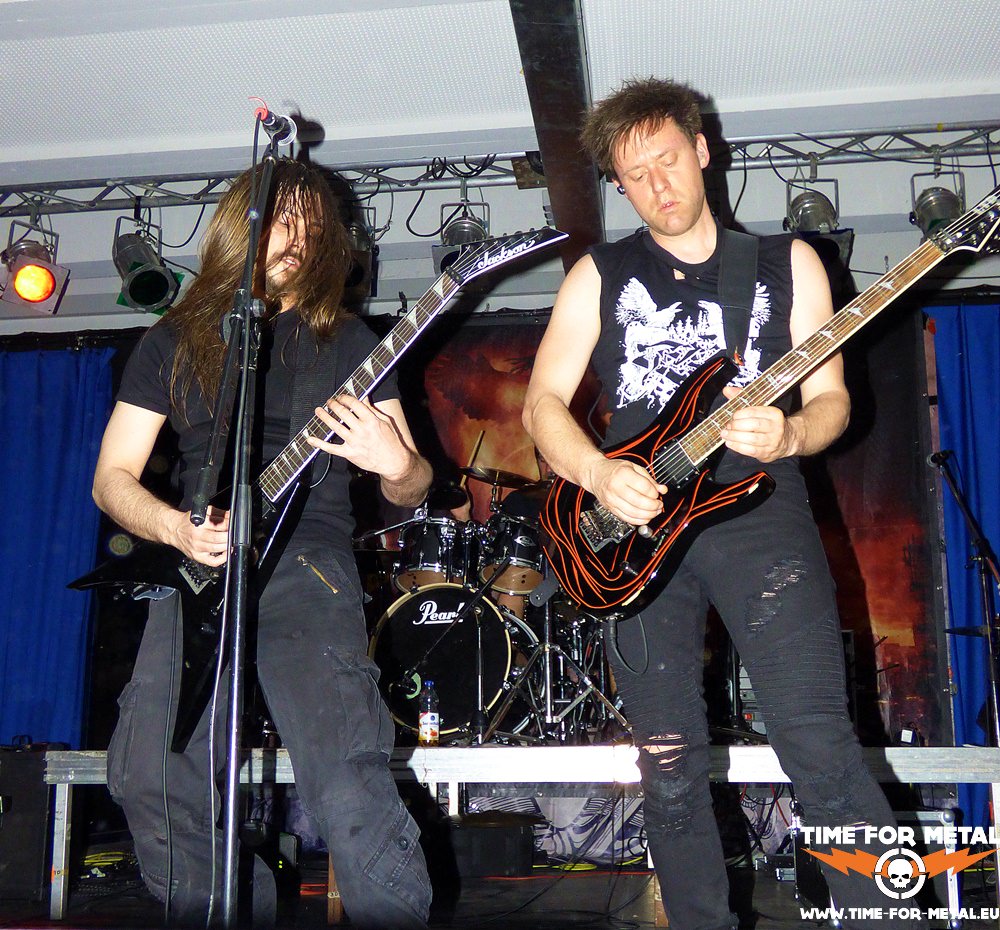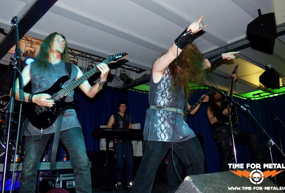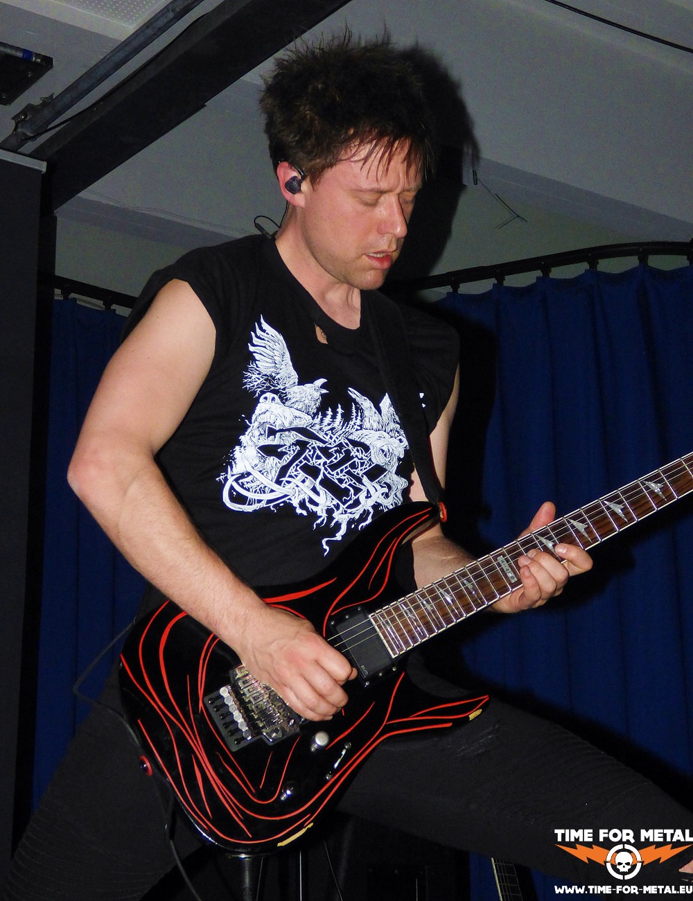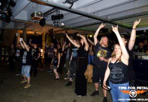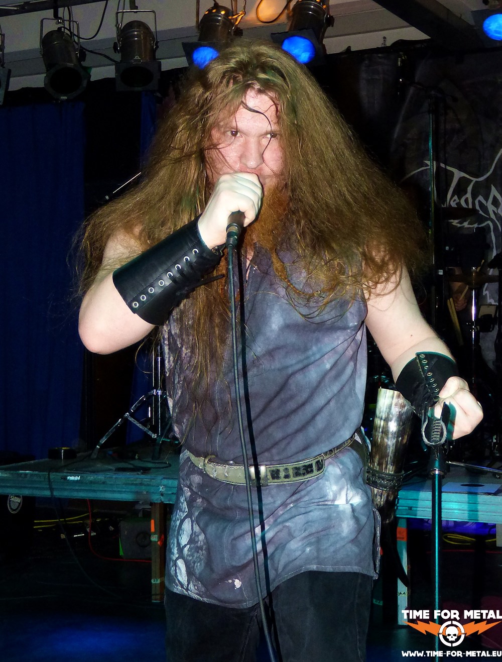 Nach kurzer Umbaupause geht es weiter mit Vedrfölnir aus dem Raum Freiburg / Waldkirch. Zwischenzeitlich sind auch noch einige Gäste eingetroffen, so dass die Freiburger vor etwa 90-100 Leuten aufspielen können. Auch die im Jahr 2010 gegründete Extreme Folk Metal-Band ist keine ganz unbekannte mehr, so konnten sie sich im Jahr 2012 beim Bandcontest Battle In De Räbe in Haltingen durchsetzen und belegten den 1. Platz. Beim Bloodbattle – Contest zum Baden in Blut – Festival in Lörrach belegten sie im Jahr 2013 den 2. Platz. Das Sextett besteht aus Michael Stockmar (Vocals), Roland Kessler (Guitar), Michael Ohnemus (Guitar), Jeremias Holub (Bass), Thorsten Engesser (Keyboards) und Jan Mortensen (Drums). Mit YMIR stürzt sich der Habicht dann gewaltig auf die Bühne und entführt die Zuschauer in die nordische Mythologie. Vom ersten Moment an wird klar, in der nächsten Stunde gibt es Folk Metal in der extremsten Form auf die Ohren. Weiter geht es mit Hasserfüllt, einem Song, der klar macht, wie man mit negativen Erlebnissen umgehen kann. Michael schreit ihn mit vielen Emotionen in die Menge, und einige können vielleicht nachfühlen, was dahinter steckt. Bei den nächsten Songs wird klar, wie experimentierfreudig die Band ist, mal fließen Folklore-Elemente mit ein, dann wieder Black & Death-Einflüsse. Schnell gespielter Metal mit melodiösen Riffs. Das Spektrum der Vocals reicht von tiefen Growls bis hin zu gelegentlichen cleanen Parts. Loki`s Rache bedient sich wieder in der Mythologie, überhaupt handeln die Songs meist von nordischen Sagen. Nach einem Gitarren-Solo werden im Publikum plötzlich Ohnemus-Rufe laut, worauf Stockmar schlagfertig witzelt –Ohne – mus nix los!-. Das Publikum ist wach und geht gut mit, doch spätestens als Michael beim sechsten Song sein Trinkhorn zückt, brechen alle Dämme. Auf`s Sauflied haben hier alle nur gewartet, und es wird gegröhlt und gebangt auf Teufel komm raus. Mit Svadilfari, dem Pferd eines nordischen Eisriesen, geht nach knapp einer Stunde das Set zu Ende. Ein beeindruckender Auftritt, der gerne bald wiederholt werden darf.