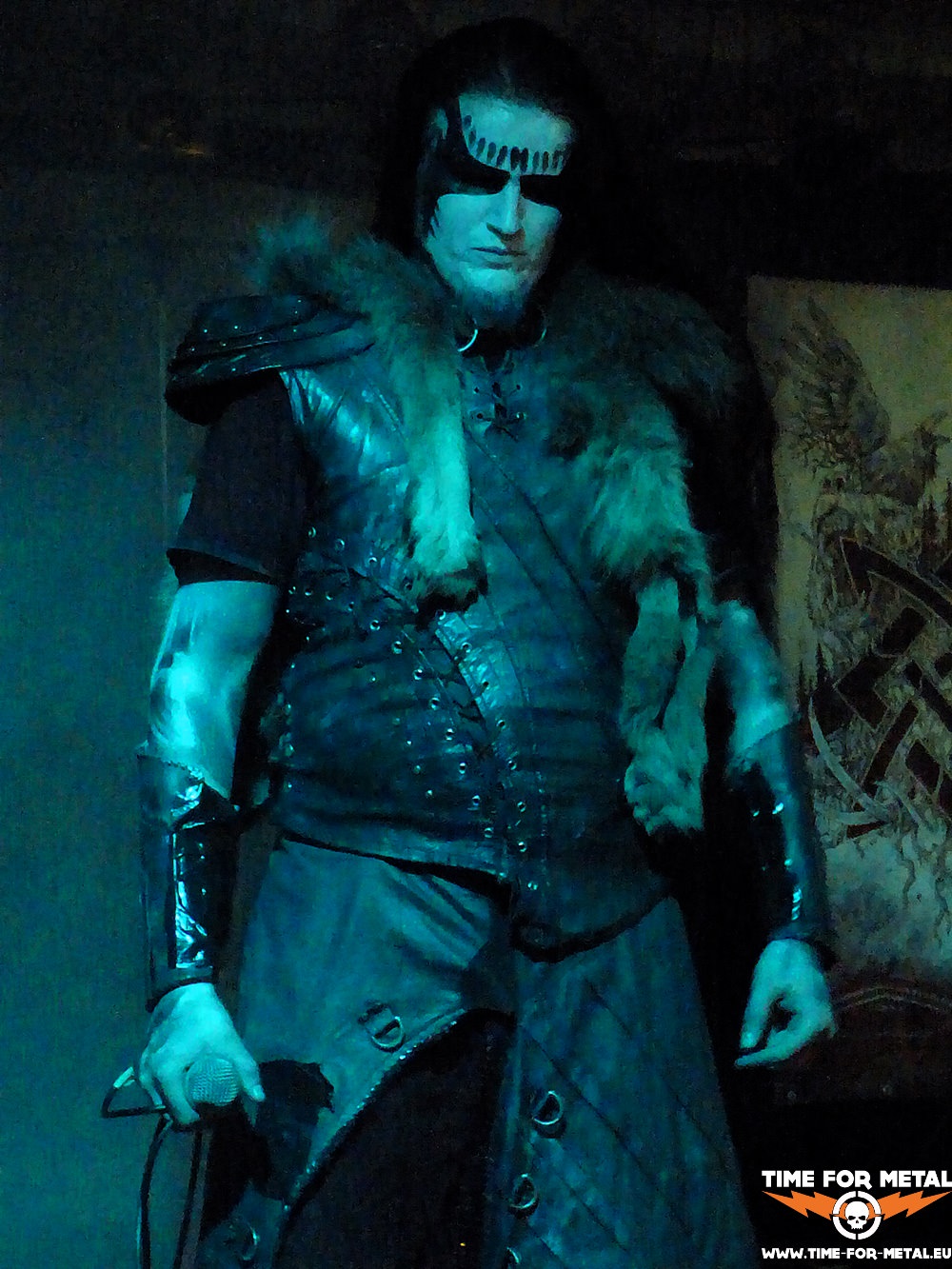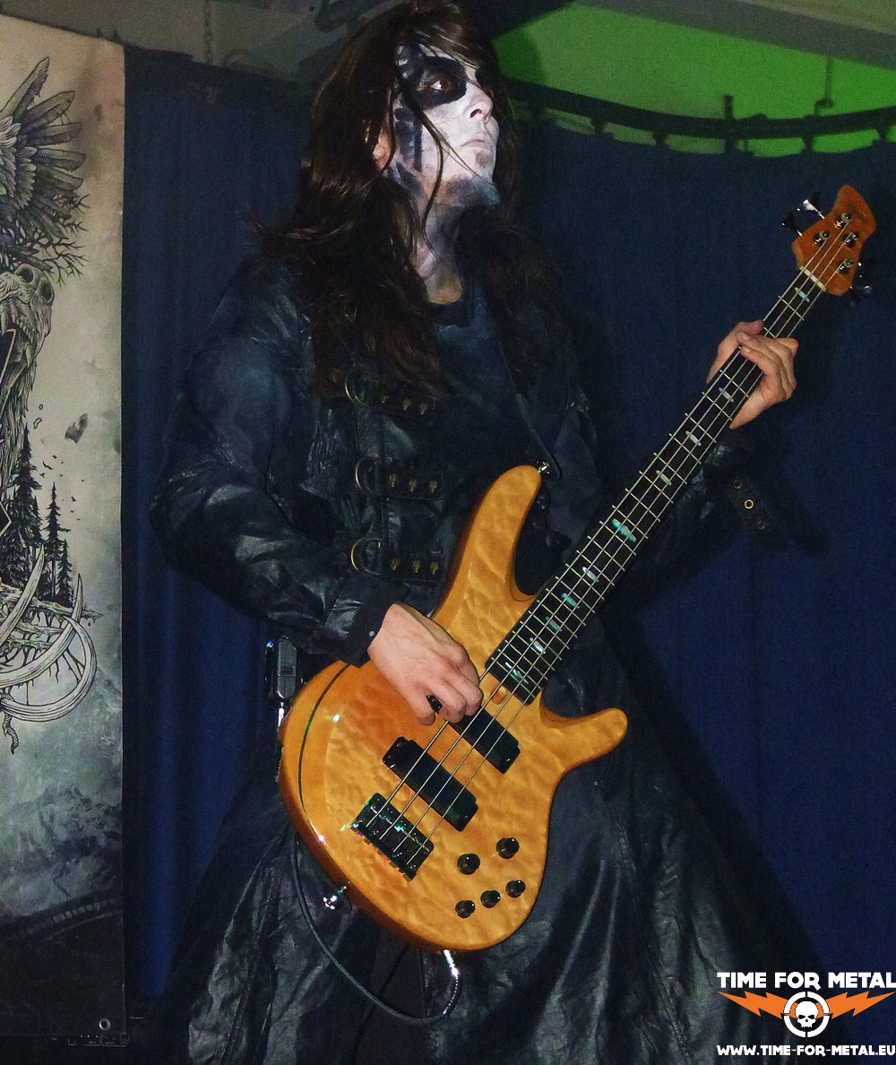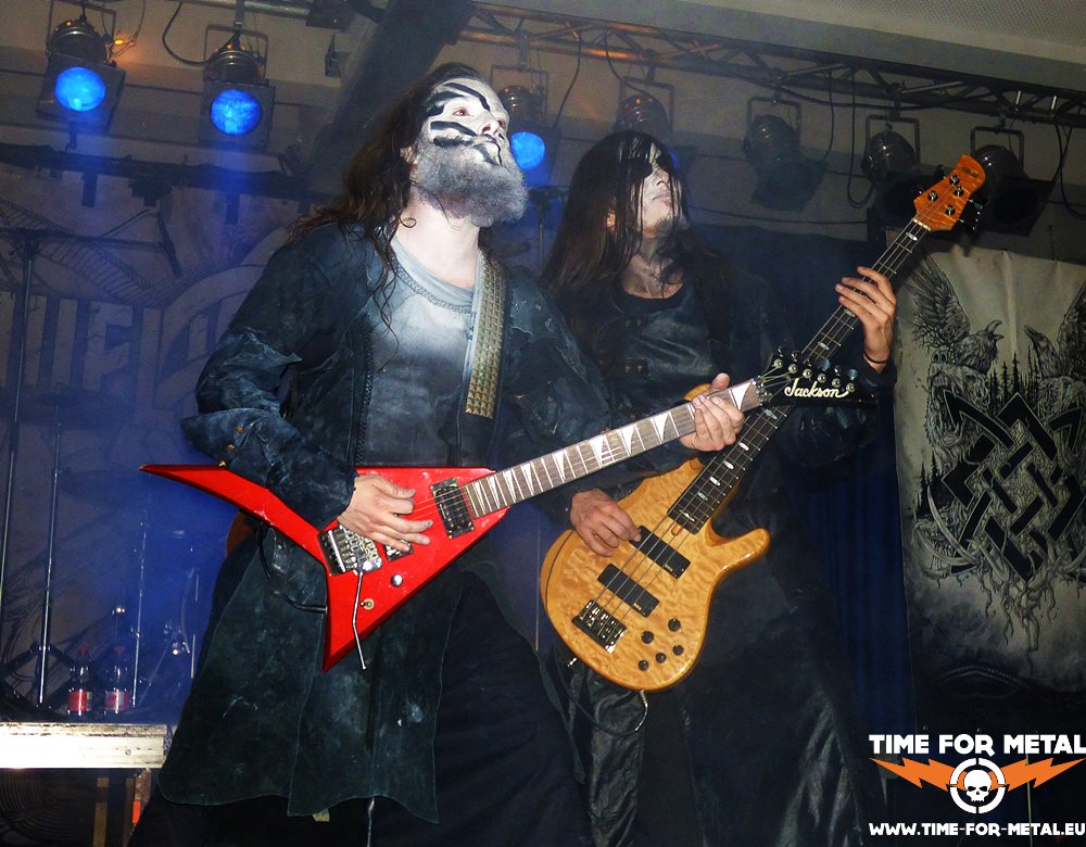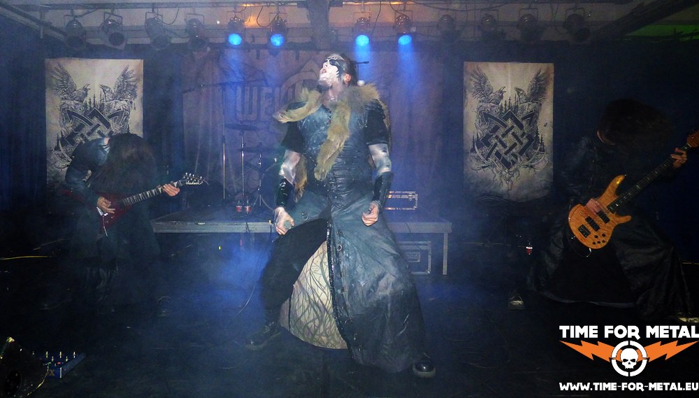 Dann wird es Zeit für die Mannen aus dem tiefsten Sibirien, die allerdings mittlerweile von Prag aus agieren. Während der Umbauzeit ist die Bühne teilweise mit den beiden großen Bannern verdeckt, so das nicht allzu viel zu sehen ist. Unverständlicherweise haben einige Besucher die Mensabar zwischenzeitlich verlassen, fast als wären sie nur für die Regio-Bands gekommen. Als das Intro dann beginnt und die Banner zur Seite gestellt werden, ist es leider ziemlich dunkel auf der Bühne. Ich meine, es ist ja nur konsequent, dass es zu Black Metal dunkel ist, aber im Fall von Welicoruss ist es schade, weil die Band passend zum schwarzen Pagan Metal im schwarzen Leder-Outfit und mit Tierfellen behangen auf die Bühne kommt, Warpaint und finstere Blicke inklusive. Mangels Licht ist davon jedoch nicht allzu viel zu erkennen. Die Band besteht aus Alexey Boganov (Vocals), Gojko Maric (Guitar), Ilya Tabachnik (Drums) und Ondrej Hec (Bass). Wie zu erwarten, geht es dann aber sofort von 0 auf 100 und die Band sowie ihr Auftreten, reißt mich gleich mit, obwohl ich kein einziges Wort russisch verstehe. Die Band fabriziert einen epischen Black Metal/Pagan Metal-Mix mit Folk-Anteilen, der dank eingesampelten Intros eine Portion Symphonic abbekommt. Das Auftreten von Welicoruss ist einfach nur heroisch zu nennen und bedient jedes Klischee. Show wird hier GROSS geschrieben. In Russland gehören Welicoruss schon einige Jahre zu den ganz großen Metal-Bands, während sie sich in Europa und speziell Deutschland erst seit 2015 auf der Überholspur befinden. Die rein russischen Texte machen es den deutschen Metalheads natürlich nicht leicht, denn das verpaßt dem Ganzen zwar noch eine rauere Note, macht das Mitsingen aber nahezu unmöglich. Vieleicht ist das der Grund, warum hier nun Aufbruchsstimmung angesagt ist und sich nur noch gut 50 Leute in der Mensabar befinden. Zwar fliegen vor der Bühne ein paar Haare, aber die große Stimmung will nicht aufkommen. Auch die Anheizanimationen von Sänger Alexey verpuffen relativ wirkungslos. An der Band kann es aber nicht liegen, die vier verstehen ihr Handwerk, haben einen exzellenten Frontmann, gute ausgefeilte Songs, brilliante Soli und mit Ilya Tabachnik einen Mann hinter der Schießbude, der, würde er in Deutschland oder den USA leben, wohl zu den ganz Großen gehören würde.