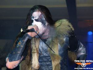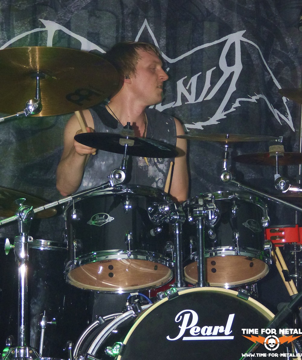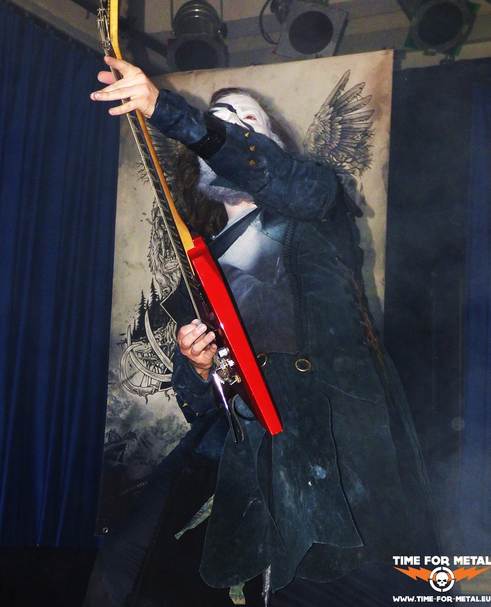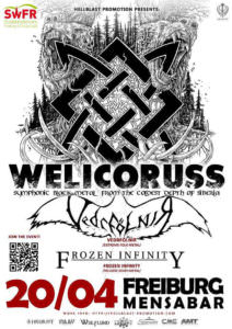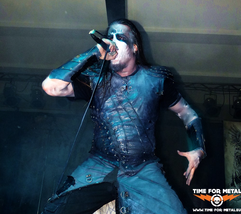 Dann wird es Zeit für die Mannen aus dem tiefsten Sibirien, die allerdings mittlerweile von Prag aus agieren. Während der Umbauzeit ist die Bühne teilweise mit den beiden großen Bannern verdeckt, so das nicht allzu viel zu sehen ist. Unverständlicherweise haben einige Besucher die Mensabar zwischenzeitlich verlassen, fast als wären sie nur für die Regio-Bands gekommen. Als das Intro dann beginnt und die Banner zur Seite gestellt werden, ist es leider ziemlich dunkel auf der Bühne. Ich meine, es ist ja nur konsequent, dass es zu Black Metal dunkel ist, aber im Fall von Welicoruss ist es schade, weil die Band passend zum schwarzen Pagan Metal im schwarzen Leder-Outfit und mit Tierfellen behangen auf die Bühne kommt, Warpaint und finstere Blicke inklusive. Mangels Licht ist davon jedoch nicht allzu viel zu erkennen. Die Band besteht aus Alexey Boganov (Vocals), Gojko Maric (Guitar), Ilya Tabachnik (Drums) und Ondrej Hec (Bass). Wie zu erwarten, geht es dann aber sofort von 0 auf 100 und die Band sowie ihr Auftreten, reißt mich gleich mit, obwohl ich kein einziges Wort russisch verstehe. Die Band fabriziert einen epischen Black Metal/Pagan Metal-Mix mit Folk-Anteilen, der dank eingesampelten Intros eine Portion Symphonic abbekommt. Das Auftreten von Welicoruss ist einfach nur heroisch zu nennen und bedient jedes Klischee. Show wird hier GROSS geschrieben. In Russland gehören Welicoruss schon einige Jahre zu den ganz großen Metal-Bands, während sie sich in Europa und speziell Deutschland erst seit 2015 auf der Überholspur befinden. Die rein russischen Texte machen es den deutschen Metalheads natürlich nicht leicht, denn das verpaßt dem Ganzen zwar noch eine rauere Note, macht das Mitsingen aber nahezu unmöglich. Vieleicht ist das der Grund, warum hier nun Aufbruchsstimmung angesagt ist und sich nur noch gut 50 Leute in der Mensabar befinden. Zwar fliegen vor der Bühne ein paar Haare, aber die große Stimmung will nicht aufkommen. Auch die Anheizanimationen von Sänger Alexey verpuffen relativ wirkungslos. An der Band kann es aber nicht liegen, die vier verstehen ihr Handwerk, haben einen exzellenten Frontmann, gute ausgefeilte Songs, brilliante Soli und mit Ilya Tabachnik einen Mann hinter der Schießbude, der, würde er in Deutschland oder den USA leben, wohl zu den ganz Großen gehören würde.