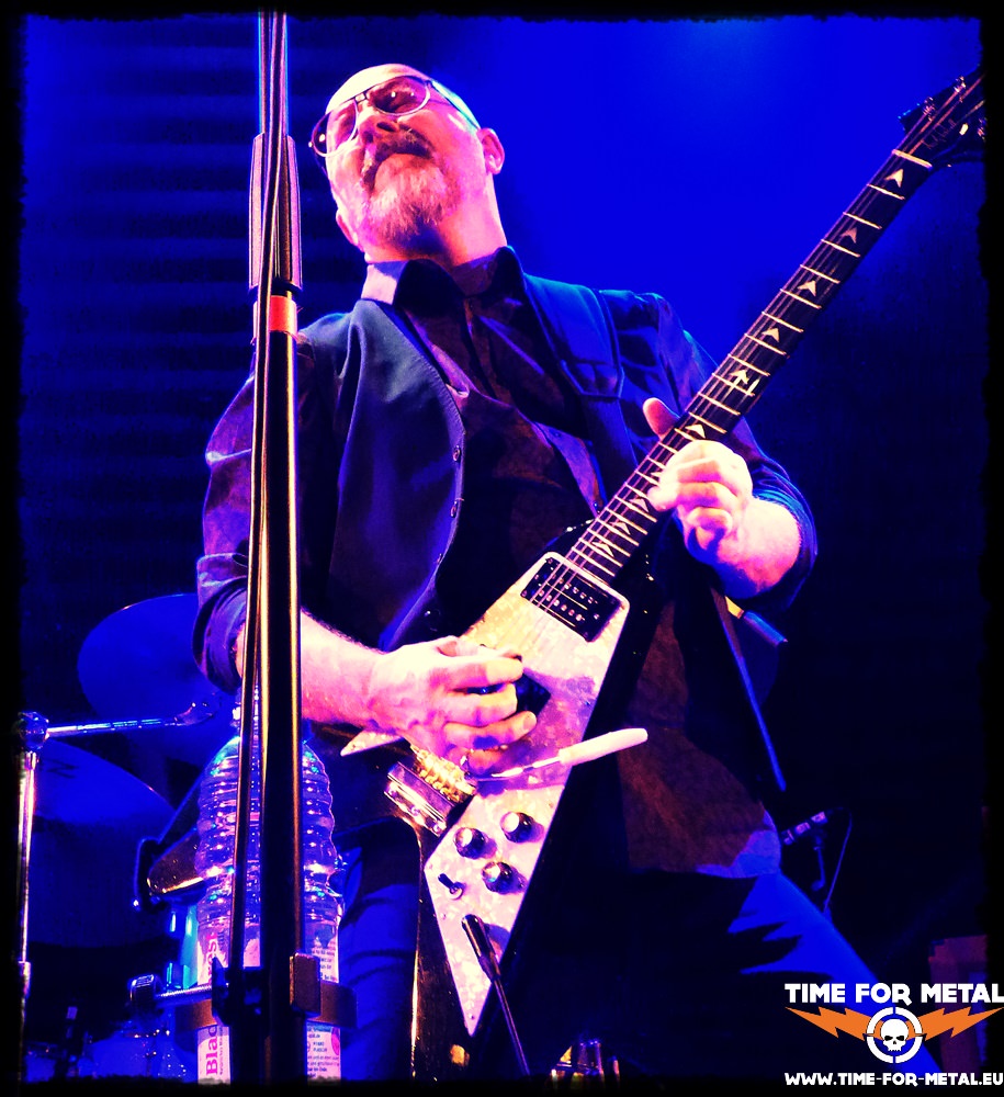 Mit etwa 10 Minuten Verspätung betritt die Band dann auch endlich die Bühne und direkt werden im Publikum einige Pfiffe laut, die Besucher sind bereit und begrüßen die Briten mit Applaus. Wortlos schnappt man sich die Instrumente und legt gleich mit Real Guitars Have Wings los, einem Song vom 1987er-Album Nouveau Calls. Schnell wird klar, Frontmann Andy Powell konnte sich über all die Jahre seine wunderbar warme Stimme erhalten und hat auch sonst nichts verlernt. Mit Bandneuling Mark Abrahams (seit 2017) an der Gitarre, Bob Skeat am Bass und Joe Crabtree an der Schießbude hat Powell eine gut funktionierende Mischung aus jungen und erfahrenen Musikern für die britische Kultband gefunden. Eine große Show wird hier nicht geboten, die Band steht auf der Bühne und spult souverän ihr Programm ab. Große Sprünge und eine wahnsinns Bühnenperformance hat hier aber wohl auch niemand von dem mittlerweile 68 jährigen sympathischen Frontmann erwartet. Dafür steht ihm aber der Spaß an der Sache förmlich ins Gesicht geschrieben, der Mann fühlt sich auf der Bühne einfach wohl und ist zufrieden, wenn er die Fans auch heute noch begeistern kann.