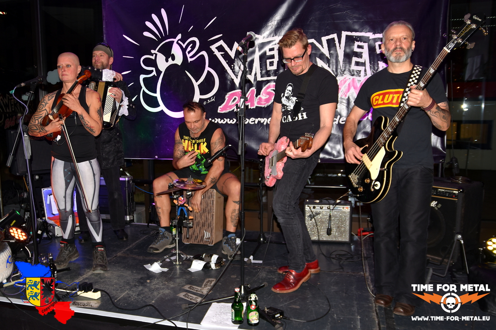 Die musikalische Begleitung durch den Abend gestalten Rakete Mendoza. Diese Kieler Band wird nicht vielen etwas sagen, mehr jedoch deren „Schlagzeuger“. Moderator Andreas Pooch alias Maschine kennt eigentlich jeder Festivalbesucher. Ob auf dem Wacken-Open-Air oder auf den Hamburg Metal Days, überall hat er sein eigenes Programm. Hier sitzt er nun am kleinsten Schlagzeug, das ich bislang je gesehen habe. Sein Sitzmöbel, eine Holzbox, und zwei Kinder-Becken sind alles. Getrommelt wird ausschließlich mit den Händen. Gespielt werden fast ausschließlich gecoverte Rocksongs in ihrem ganz eigenen, eigenwilligen Stil. Durch das Set-Up mit Geige, Akkordeon, Cajon, Bass, E-Gitarre und mehrstimmigem Gesang wird den Songs ein eigener Stempel aufgedrückt. Rein optisch wird nicht viel Wert auf Authentizität gelegt. Mit einer rosa plüschüberzogenen Gitarre und einem Johnny Cash-Shirt werden Klassiker wie