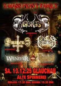 Auf der Bühne stehen Andras, Eminenz, Krater, Wandar und Numinosity. Jede Band bringt ihren eigenen Sound mit – von düsterem Black Metal über epische Pagan-Sounds bis hin zu brachialem Death Metal – und sorgt so für ein abwechslungsreiches, energiegeladenes Programm. Die Heavy Family im Eventnamen wird spürbar, nicht nur musikalisch, sondern auch in der Atmosphäre zwischen Bühne und Publikum.