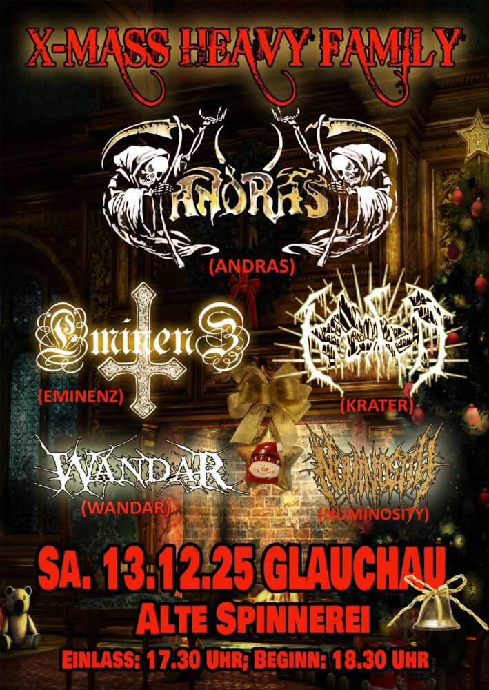 Am 13. Dezember 2025 verwandelt sich die Alte Spinnerei Glauchau noch einmal in einen Treffpunkt für extreme Klänge: Rund 500 Besucher erleben die X-Mass Heavy Family, eine Veranstaltung, die Black Metal, Epic Pagan Metal und Death Metal auf einer Bühne vereint. Mit einem Eintrittspreis von 28,20 € im Vorverkauf bietet der Abend ein hochkarätiges Line-Up und gehört zu den letzten Konzerten in dieser traditionsreichen Location.