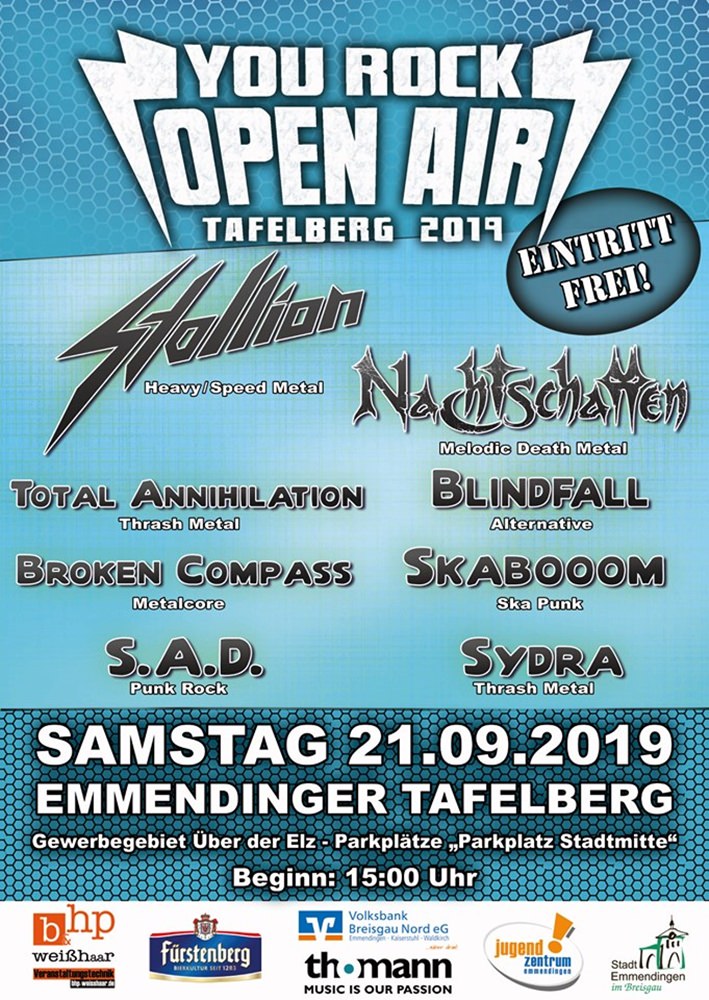 Eigentlich hatte ich heute ein anderes Event beim Metalspeck Festival in Kehl mit u.a. Angelcrypt und Ektomorf, doch da mein Auto momentan seinen eigenen Kopf hat, musste ich das kurzfristig absagen. Dadurch bietet sich nun jedoch die Möglichkeit, bei der dritten Ausgabe des YouRock Open Airs in Emmendingen vorbeizuschauen, welches für mich auch ohne Auto zu erreichen ist. Gegen 14:30 Uhr erreiche ich die Naturarena Tafelberg im Emmendinger Gewerbegebiet, und es verspricht ein herrlicher Spätsommertag zu werden. Insgesamt acht Bands werden heute für einen abwechslungsreichen Stilmix aus Metal, Alternative Rock, Punk und Ska sorgen. Das Open Air kostet, wie schon bei den ersten beiden Ausgaben, keinen Eintritt, jedoch wird um Spenden gebeten, damit man auch in Zukunft weiterhin Konzerte organisieren kann.
